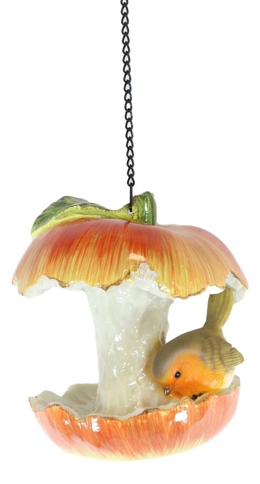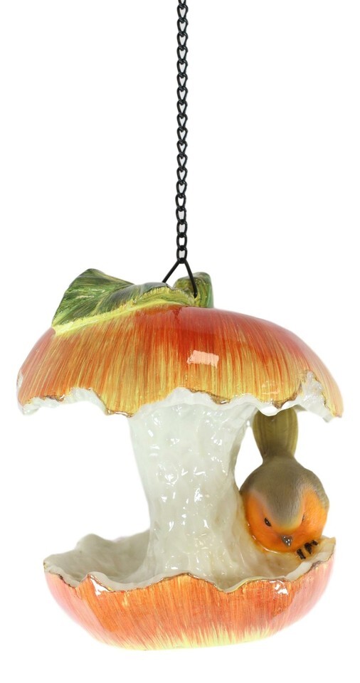 ? This bird feeder will look right at home hanging from a tree branch, patio corner or what have you. Modeled after a familiar fruit, the scrumptious red apple, we include a finch perching on its gobbled up flesh! Delightful to look at, the bird feeder has plenty of room for your garden's smaller bird friends to hover and feed!