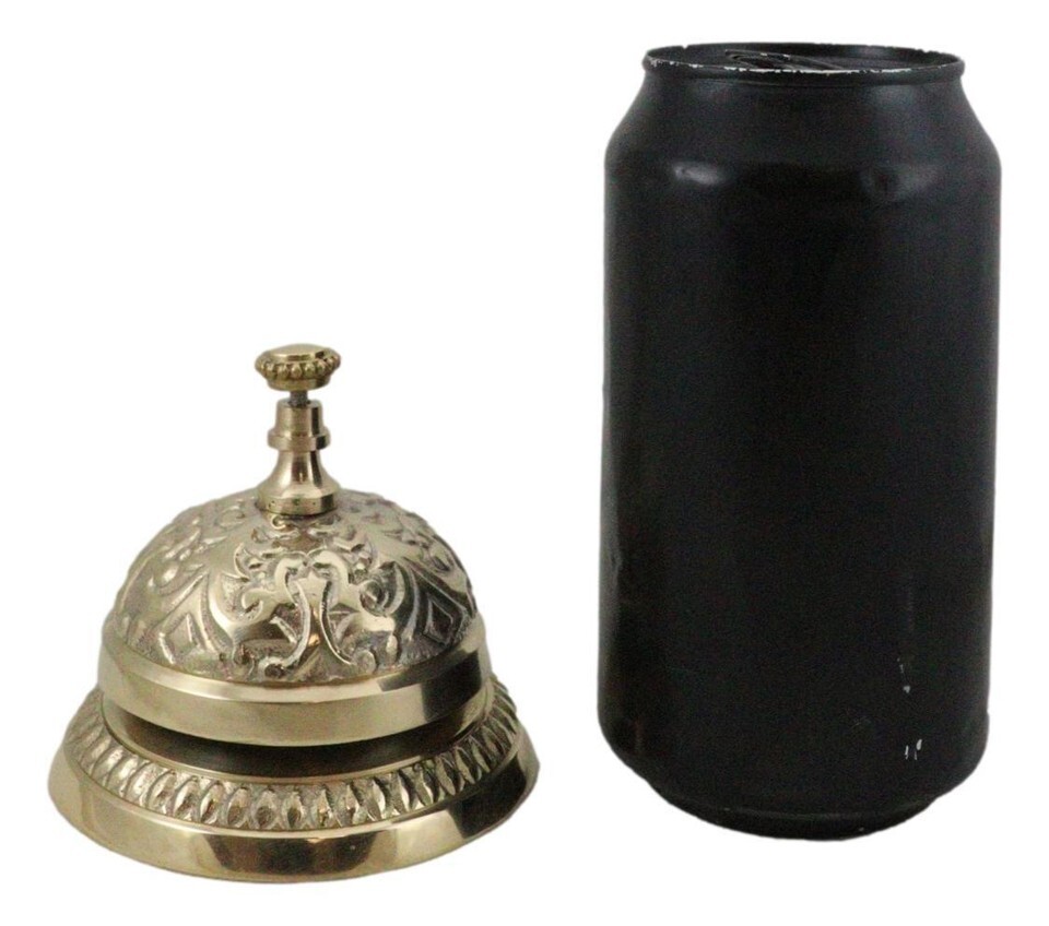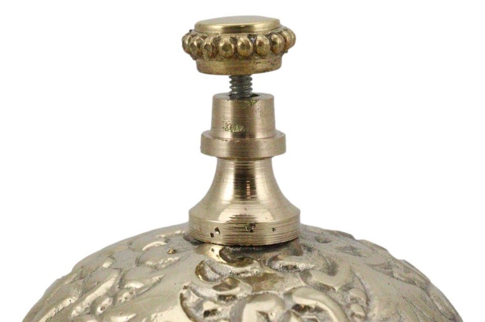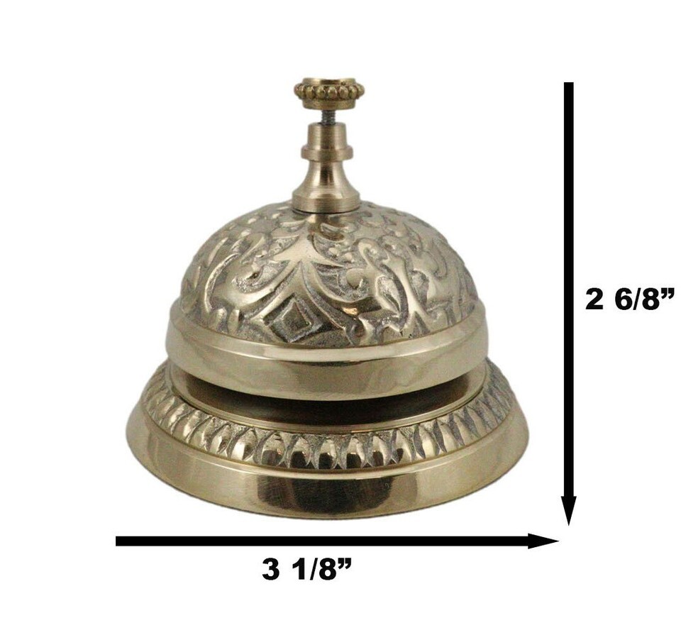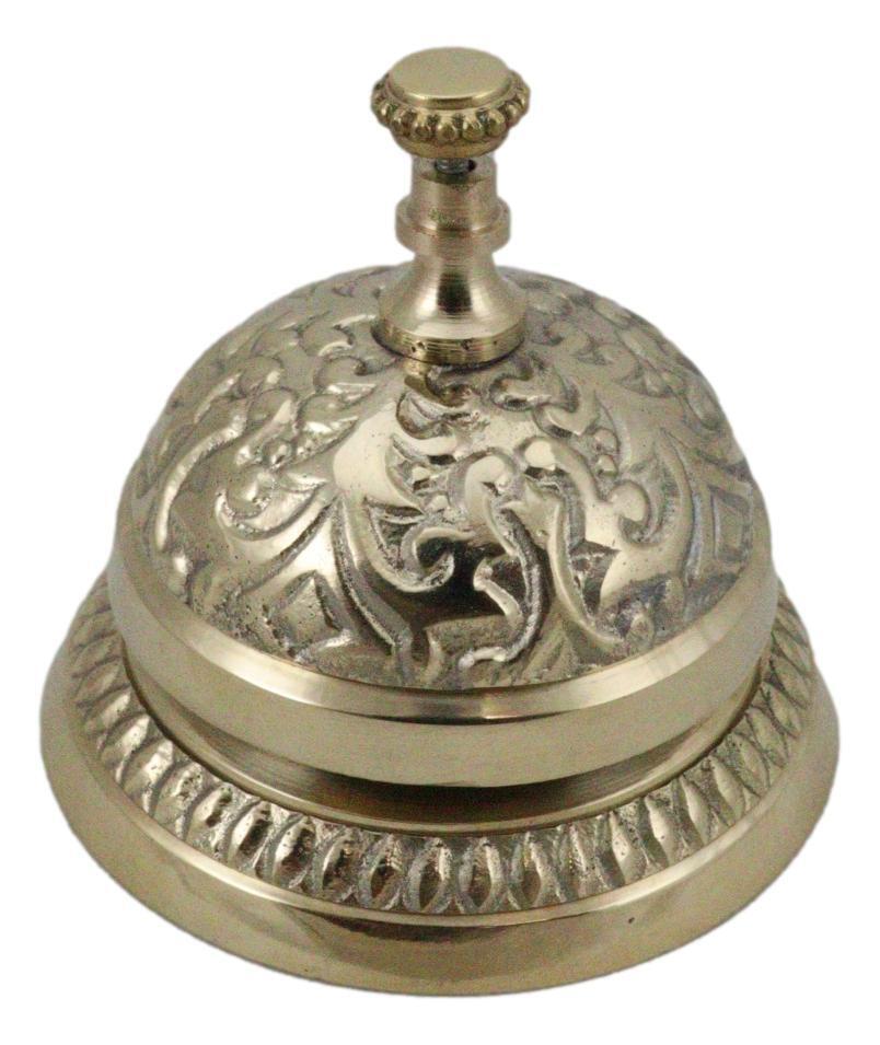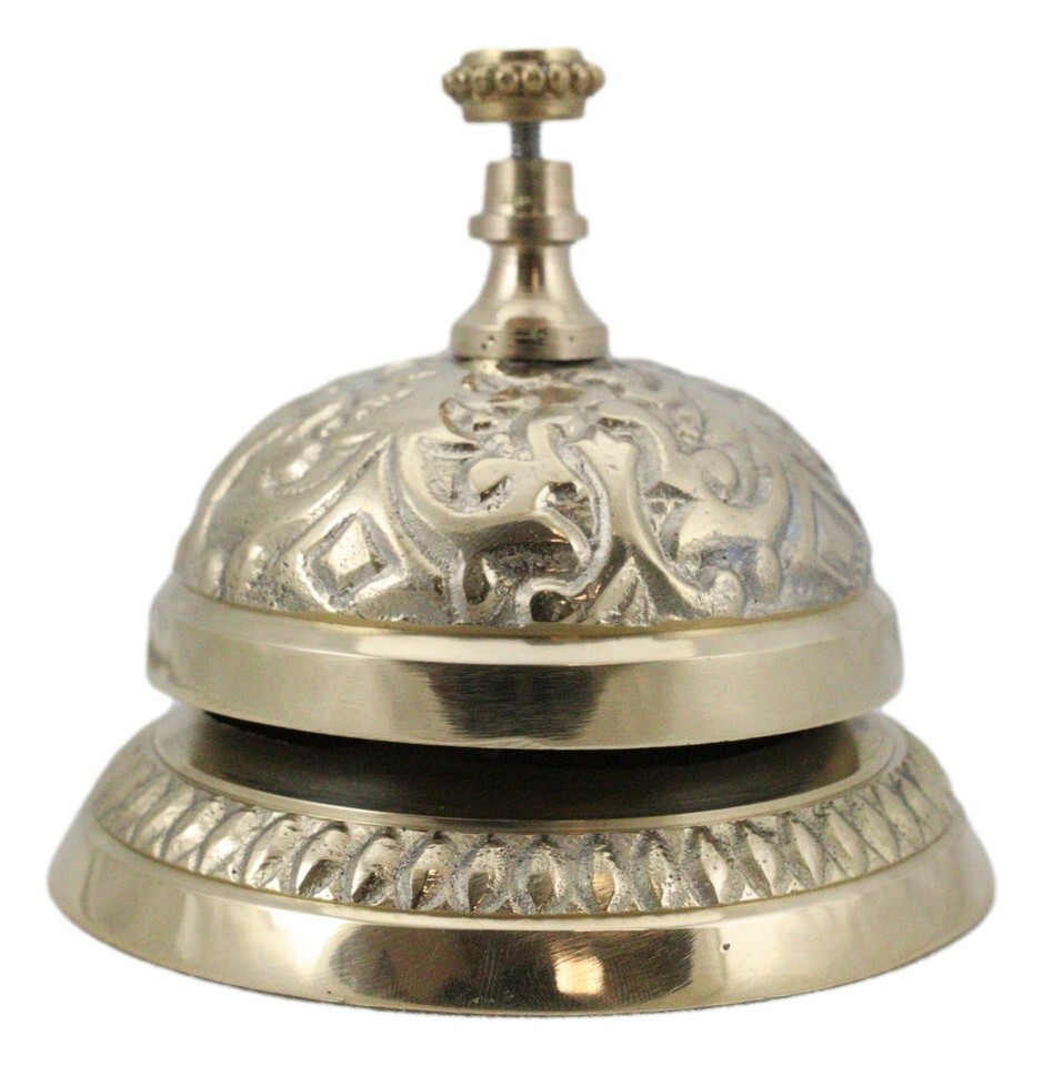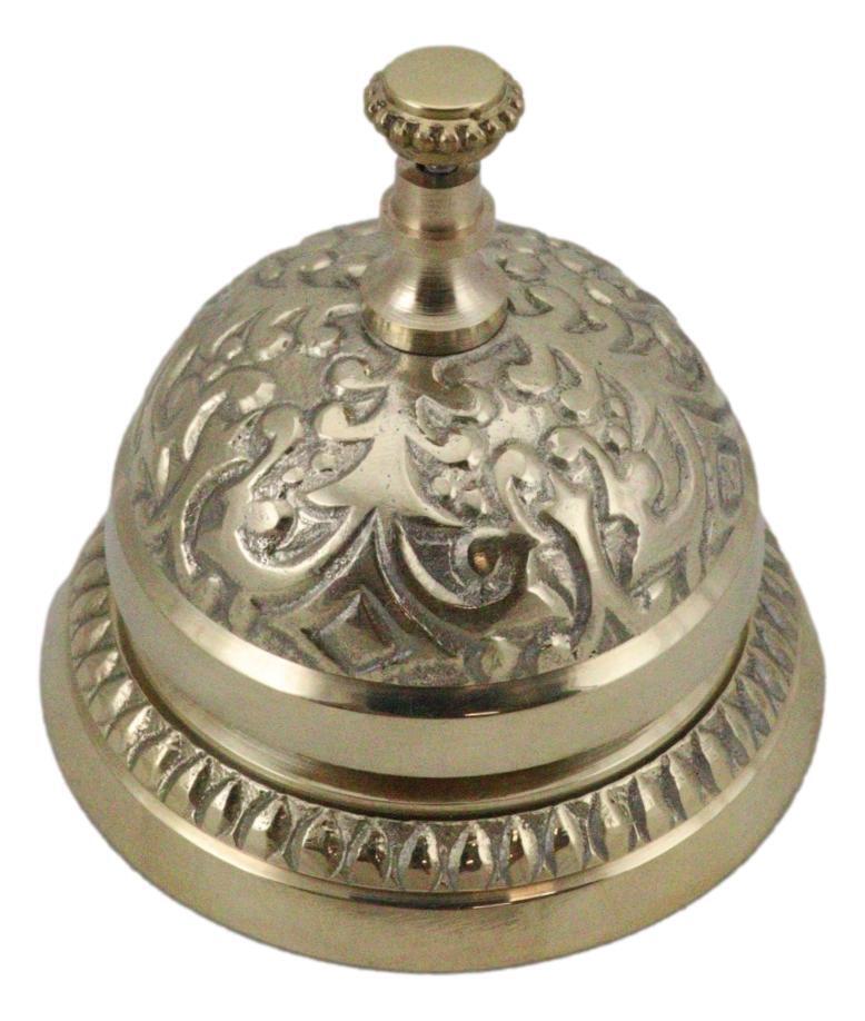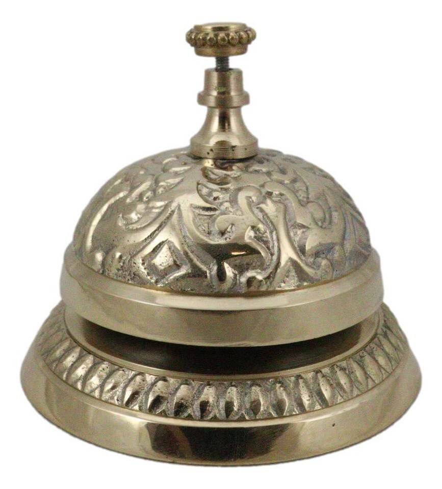 ? Add some ornate, Victorian-era decor to your hotel or retail business front desk with this antique-style desk bell. Traditionally used to call bellhops for hotel clientele and in shops for customers to ring for service, this elaborately detailed counter bell is a reproduction of antique brass bells used years ago. Solid, polished brass counter bell is great, ornate decor and has a loud, resounding ding to capture anyone's attention.
