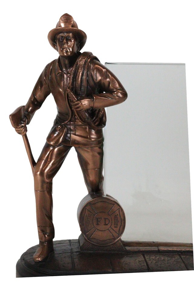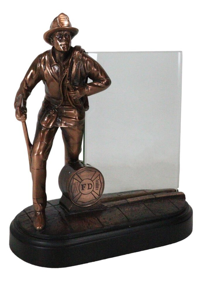 ? Celebrate the heroism and bravery of firefighters with this stunning fireman with axe and hose sculpture. The highly detailed design features a firefighter in action, with an axe and hose ready to save lives and fight fires. The accompanying glass frame allows you to engrave or imprint images or words to customize the item.