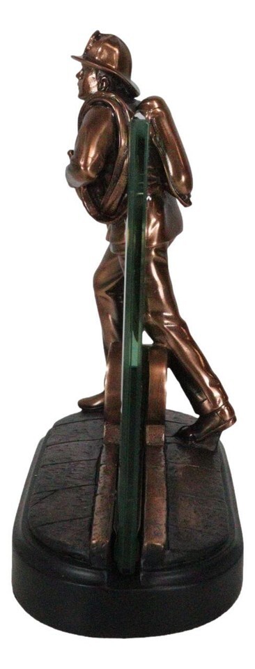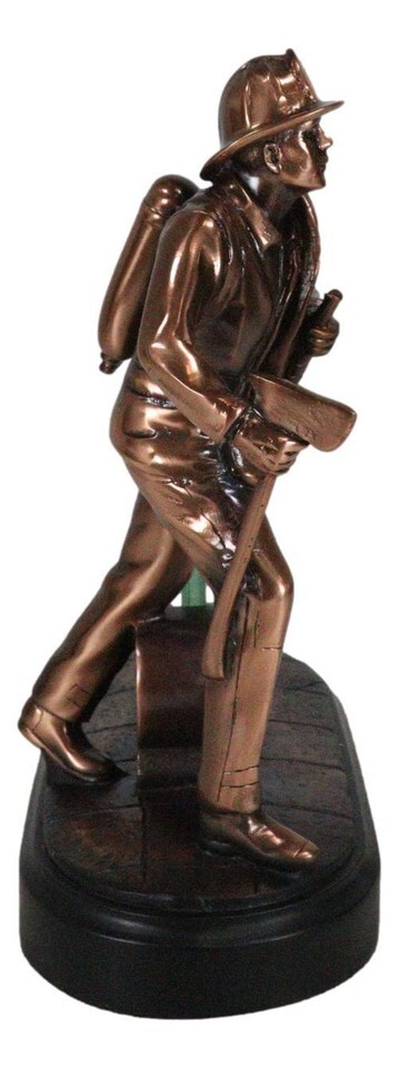 ? This Impressive Fireman Sculpture is made of the highest quality resin, undergoing the process of bronze electroplating giving it a uniform shine on the inside as well as the surface of the figurine. This process makes the figurine resemble the look of actual bronze but with much lesser weight. To add sculptural aesthetics and display worthiness, we add accent black faux wooden base to the sculpture.