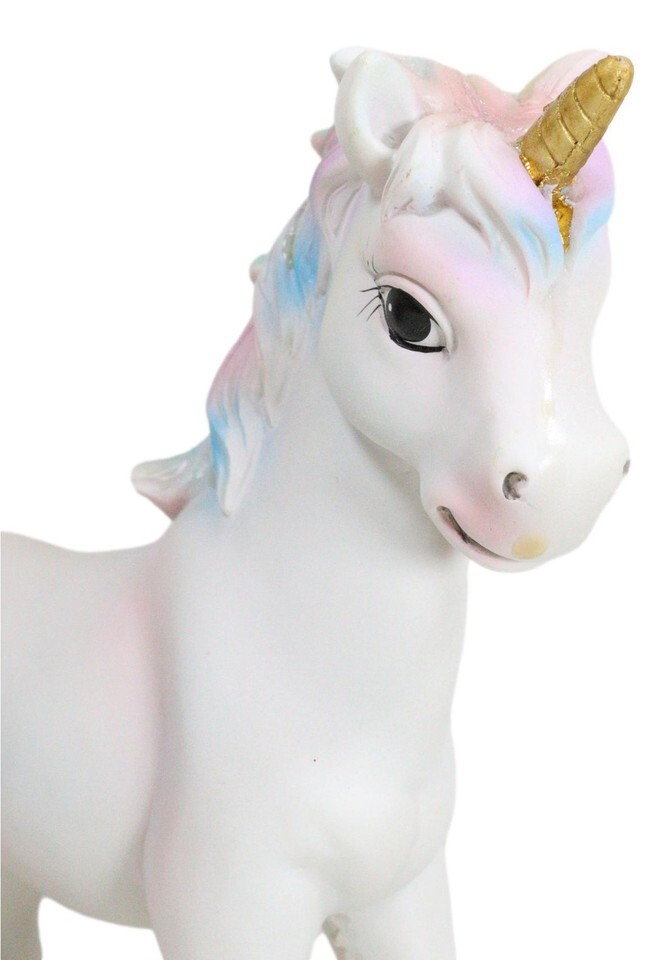 ? This Beautiful Rainbow Mane Unicorn Mare sculpture is made of designer composite resin, hand painted and polished individually. The unicorn is painted in pastel color finish making it extra whimsical and nursery like.