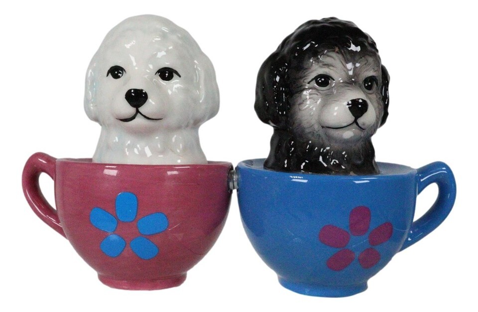 ? What a cute and perfect gift for a loved one or for your personal collection of salt pepper shakers!!!! 2 Maltese puppies are nestled in colorful teacups.
