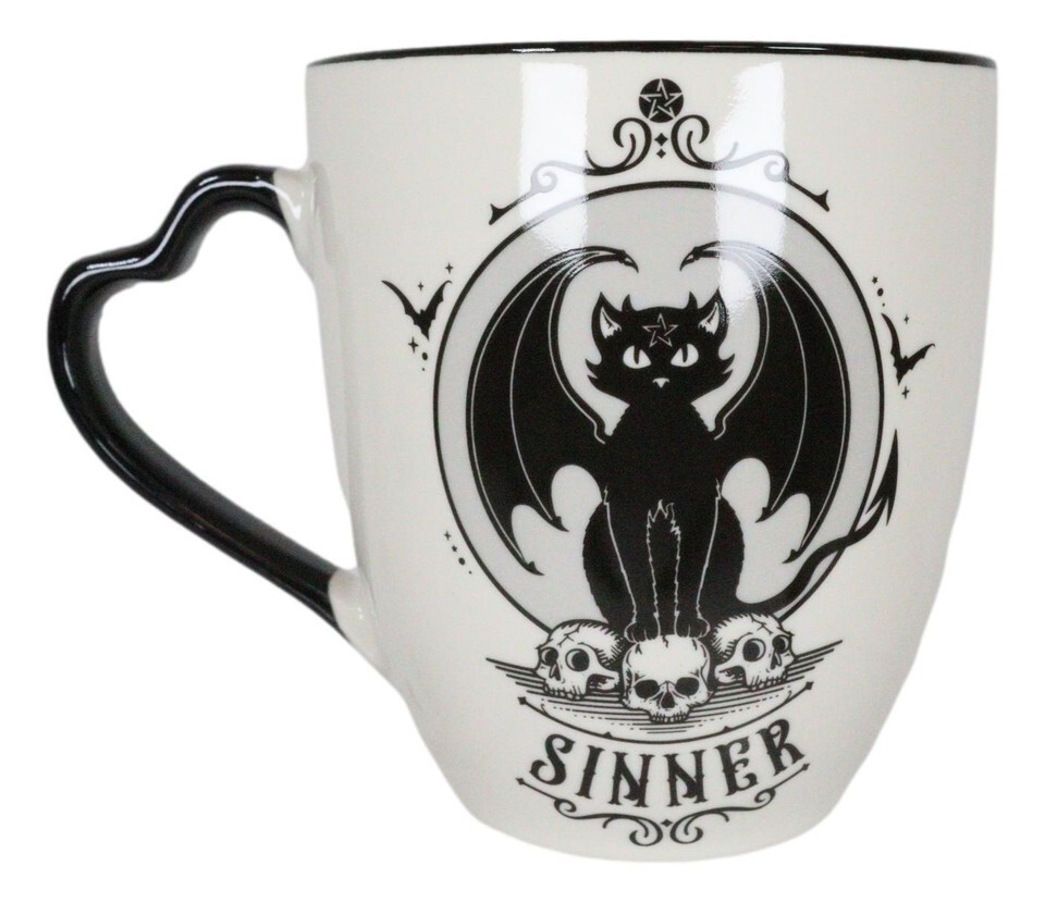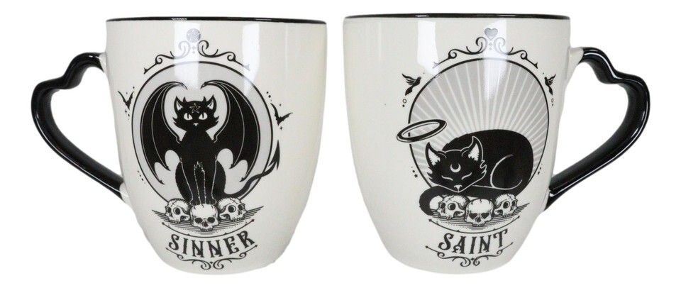 ? Saint or Sinner! You choose! These double sided couple mugs mean you can show your other half just how you're feeling! Featuring unique Alchemy art work on both sides of the mug. One side is saint cat and on the other side is sinner cat! One day a sinner, turn the mug around and the next time your use your mug, you are a saint!! These mugs are perfect for however you're feeling!