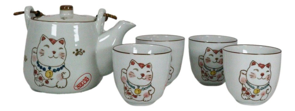 Ebros Japanese Maneki Neko Ceramic Tea Set Pot and Cups Lucky Charm Cat Serves 4