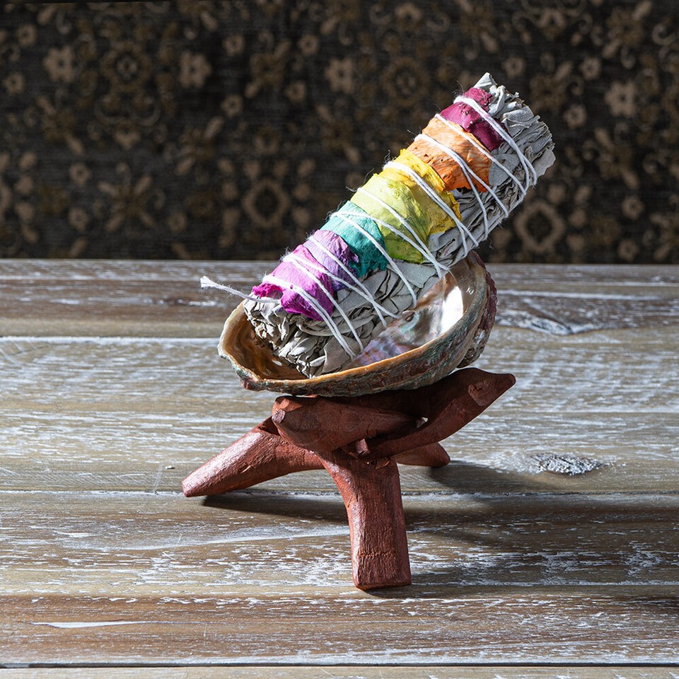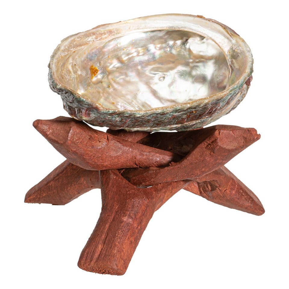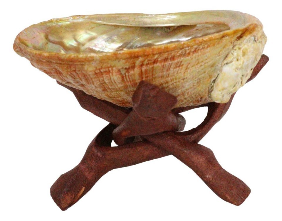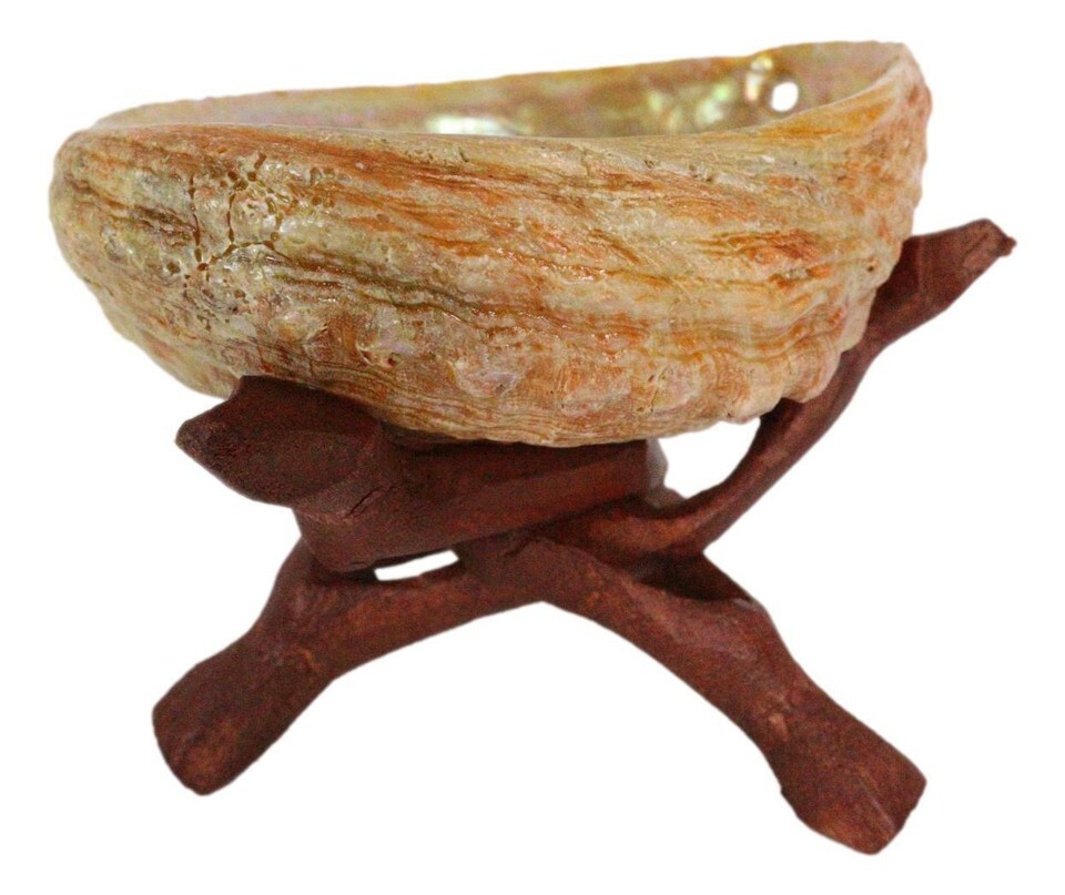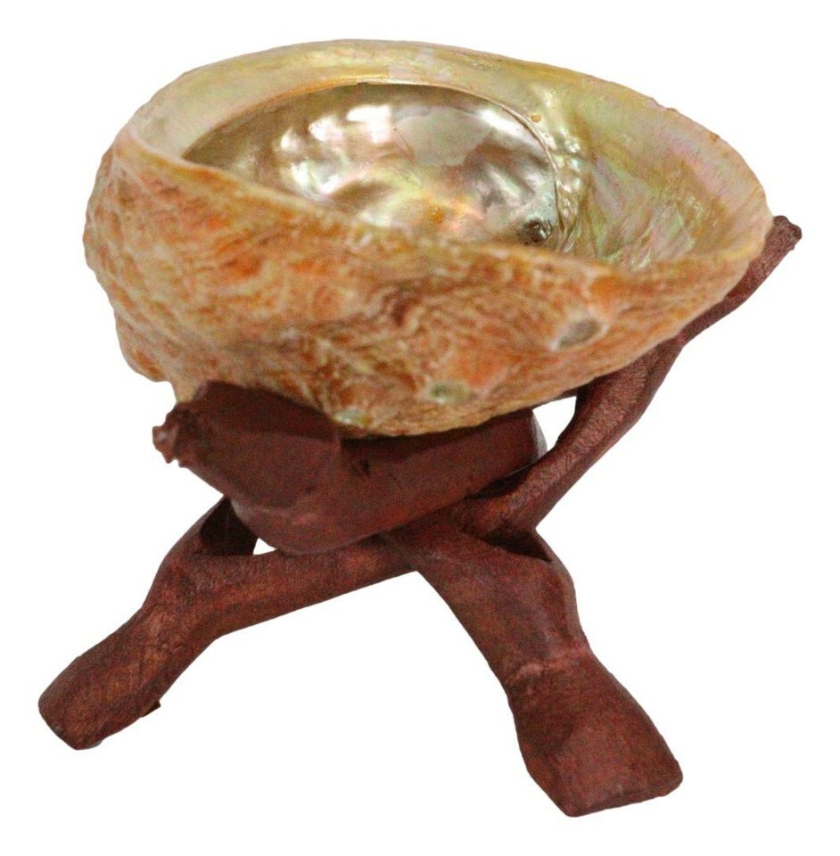? A natural, hand-carved wooden tripod stand adds to it's upfulness. Each shell is unique in form, color, shape and size. Utilize this shell and tripod stand with your smudge stick, sage, palo santo, etc. Creates a sacred space during energy clearings, yoga, meditation, home fragrance, and incense burning. The wooden tripod stand is 4.25" high.