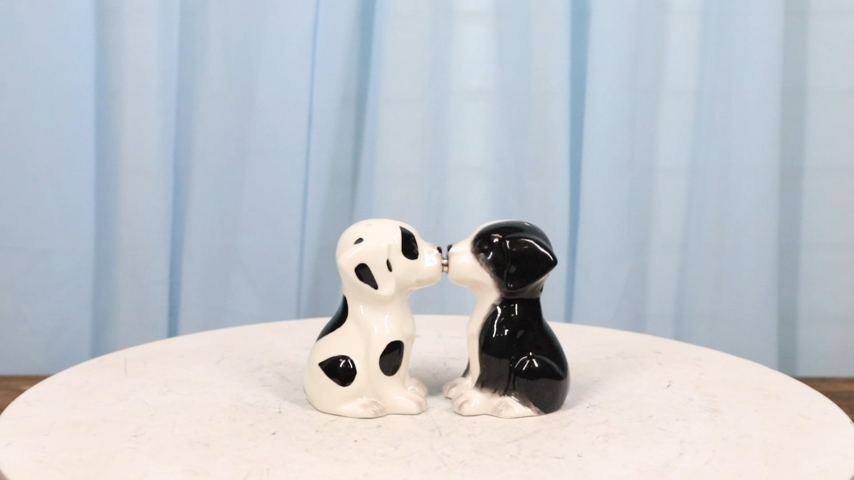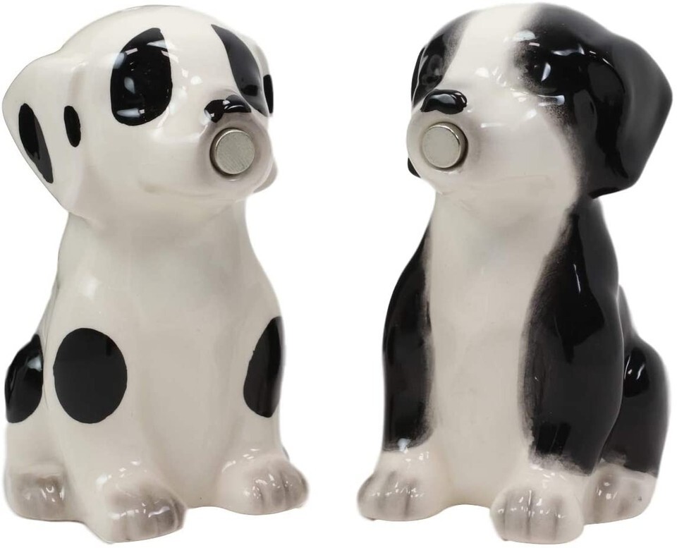 ? This Black And White Mutt Puppy Dogs Salt And Pepper Shakers Set is made of high quality glossy ceramic, hand painted and polished individually.