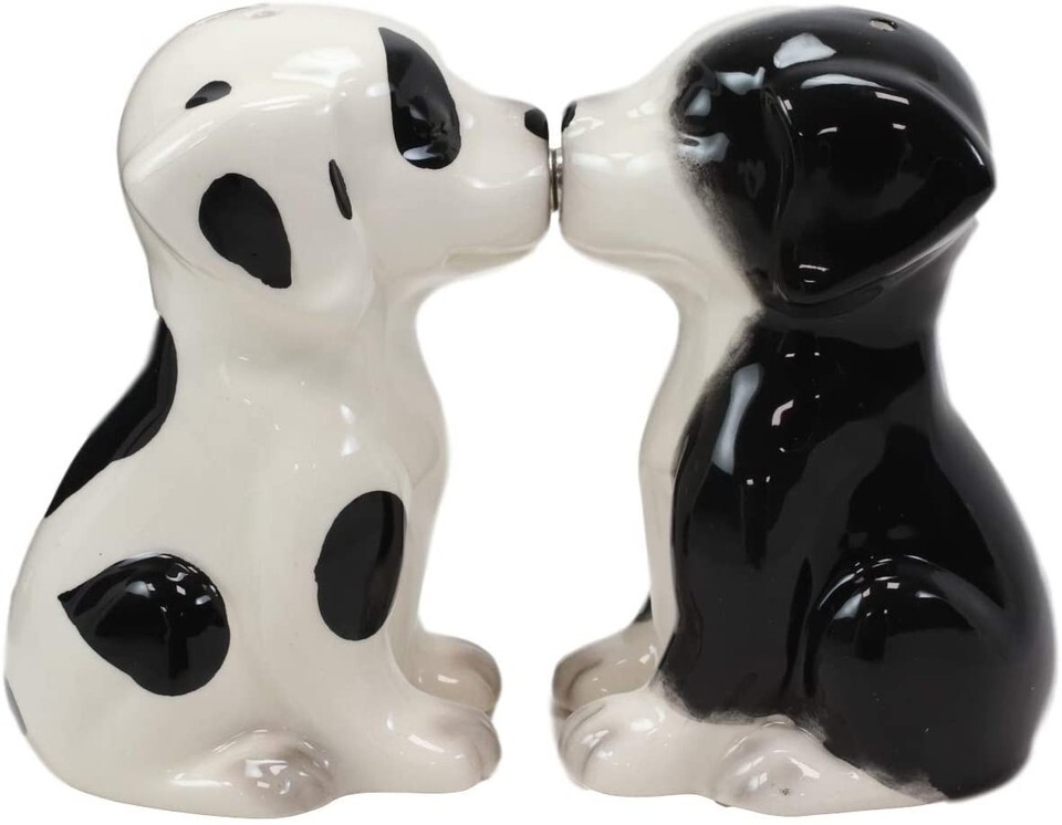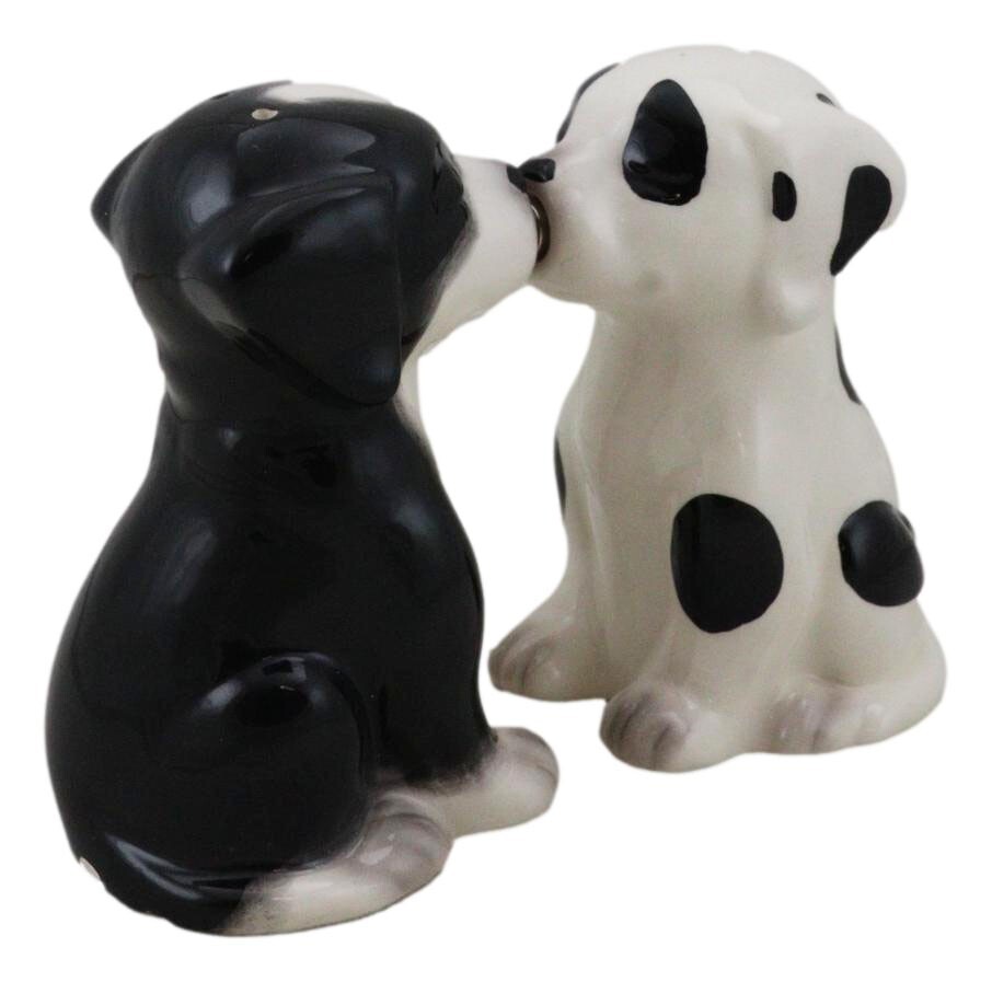 Ebros Ceramic Black & White Mutt Puppy Dogs Kissing Salt And Pepper Shakers Set
