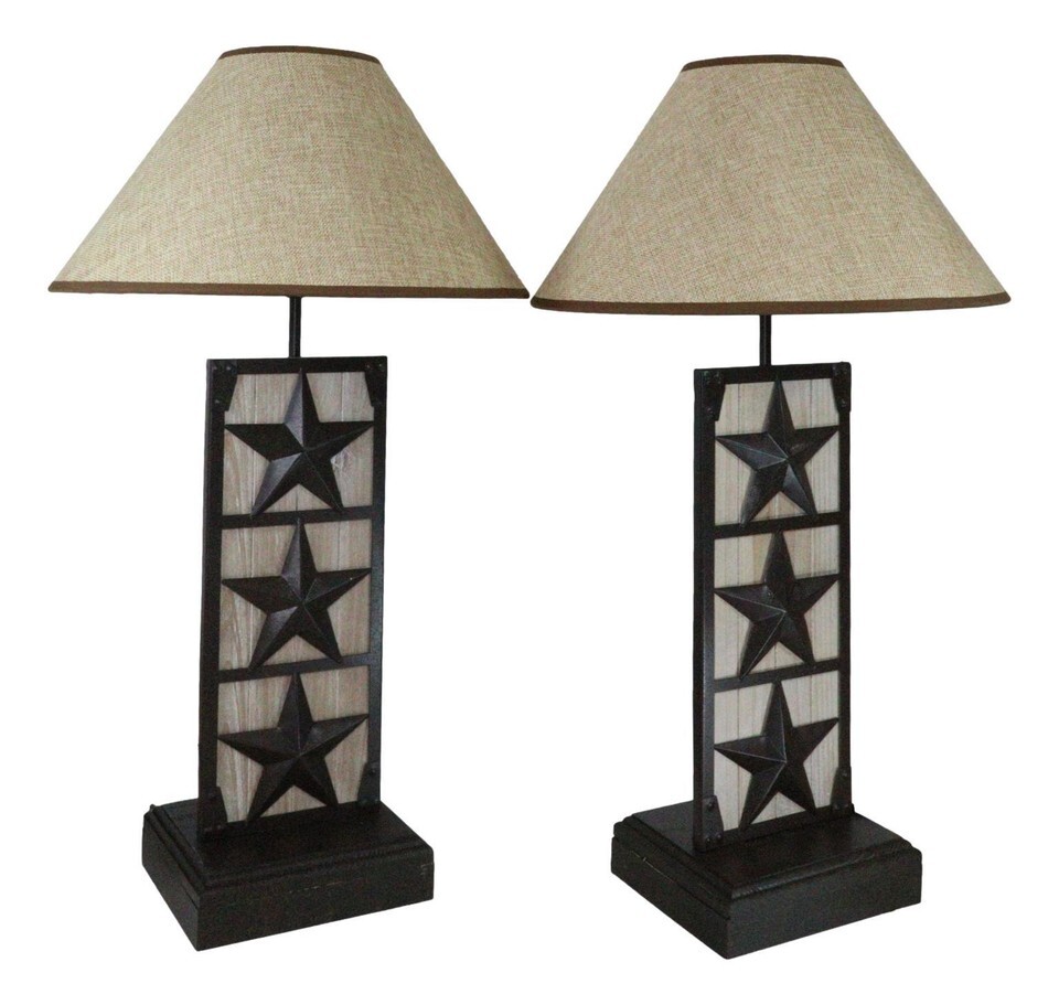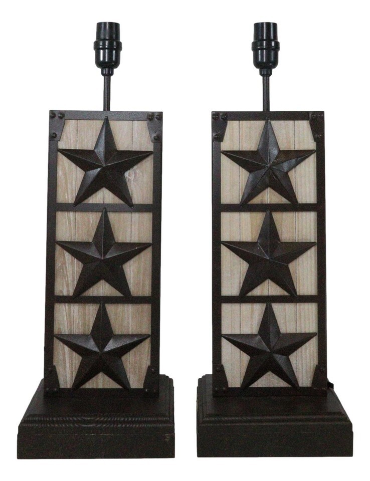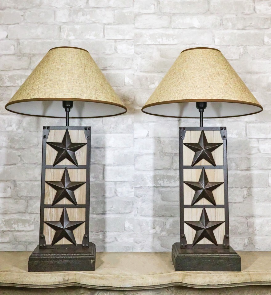 Set of 2 Rustic Western Triple Lone Stars Wood And Metal Bedside Table Lamps