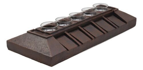 ? This Frank Lloyd Wright Votive Candle Holder is made of polyresin, hand painted and polished individually. This decor comes with five glass vessels to hold tea lights in. We DO NOT provide the candles.