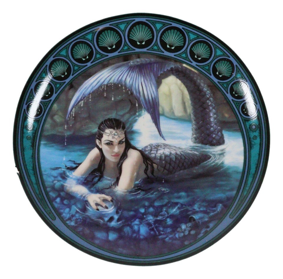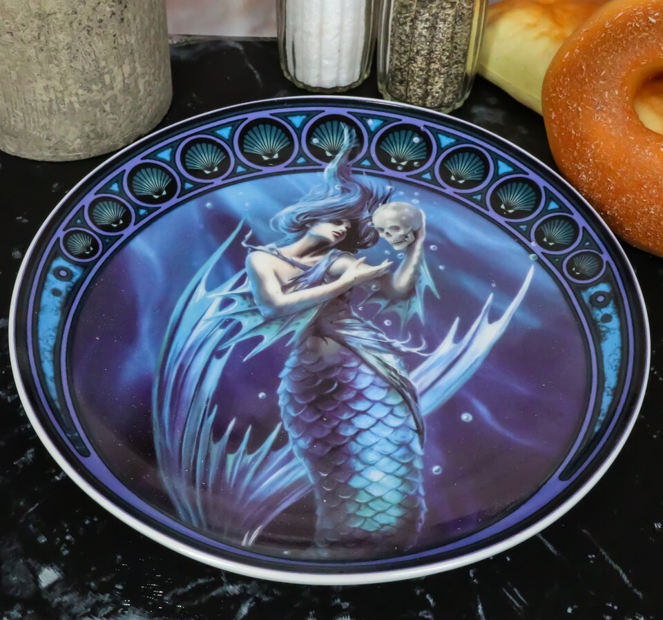 ? These Anne Stokes servewares consist of 4 designs; Sailors Ruin, Hidden Depth, Sirens Lament and Soul Purpose. Each design depicts mermaids as sirens of the seas which are notorious for bringing down sailors to the depths of the ocean to their doom. They lure men with their beauty, charm and sexuality. These round plates are perfect for your appetizers, small salad servings, desserts or what have you!