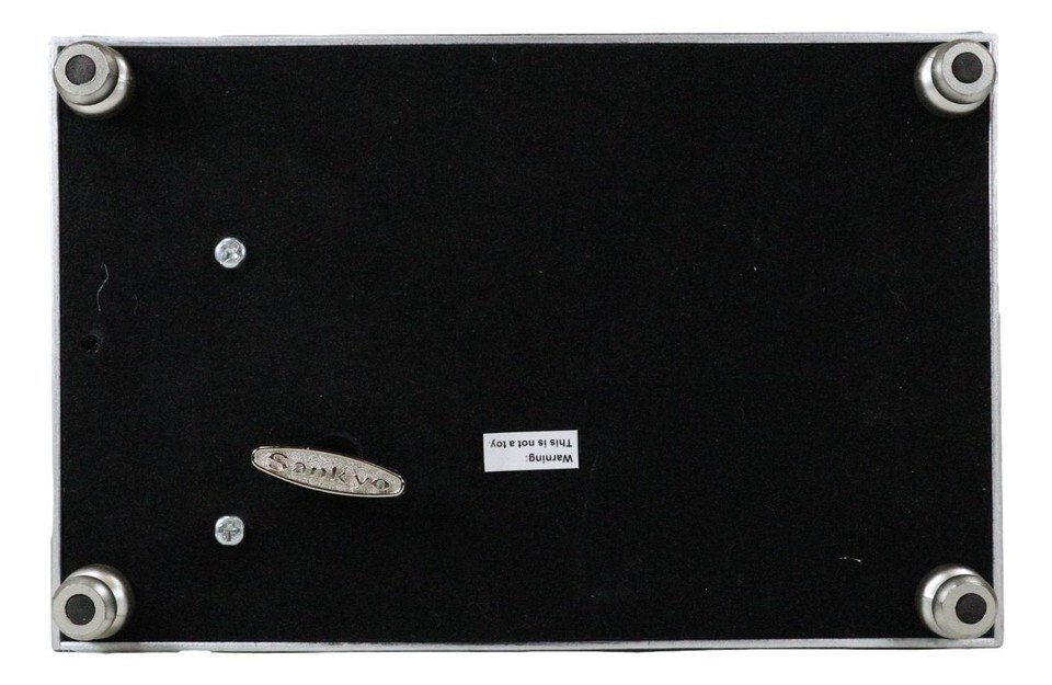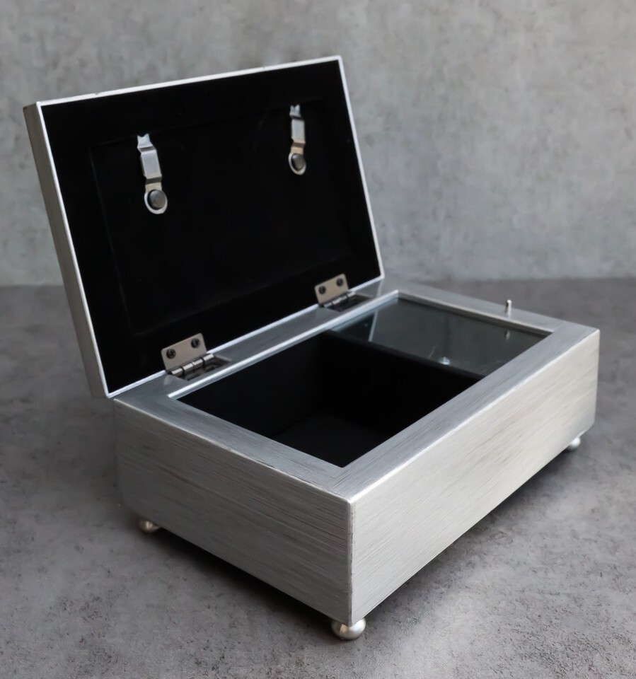 ? Beautiful birthstone jeweled photo frame lid and sweet word sentiment art gives this music box a timeless appeal. Brushed silver finish on the exterior. Personalize this box by replacing the sentiment artwork with 4 x 2 inch photo. Traditional wind-up mechanism engages music to play melodic tune You Light Up My Life. Black velvet lined interior compartment cushions your precious treasures; Decorative bun feet are padded to protect furniture surfaces.