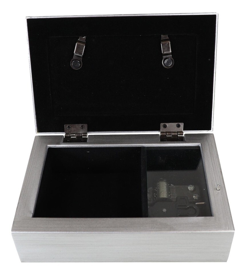 ? Beautiful birthstone jeweled photo frame lid and sweet word sentiment art gives this music box a timeless appeal. Brushed silver finish on the exterior. Personalize this box by replacing the sentiment artwork with 4 x 2 inch photo. Traditional wind-up mechanism engages music to play melodic tune You Light Up My Life. Black velvet lined interior compartment cushions your precious treasures; Decorative bun feet are padded to protect furniture surfaces.