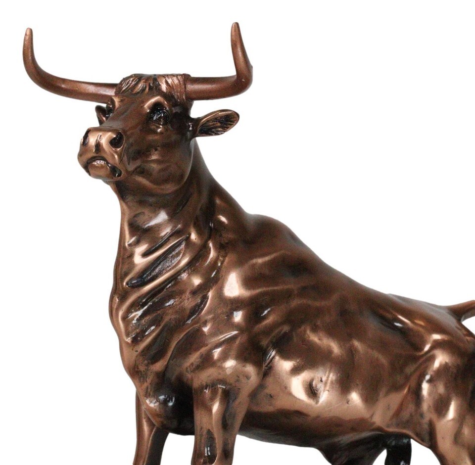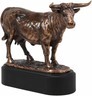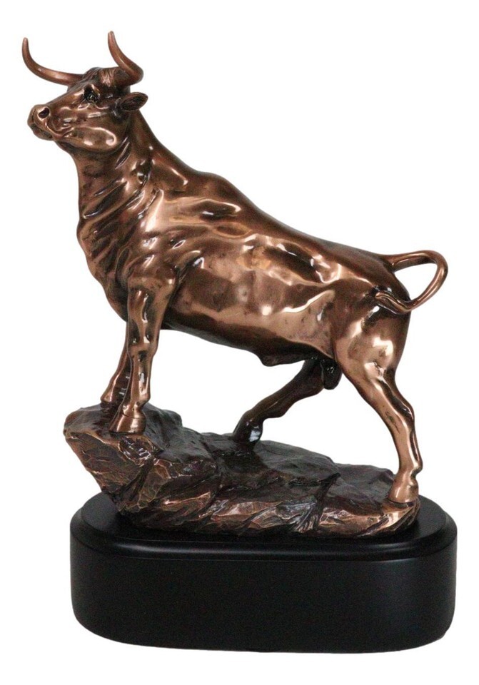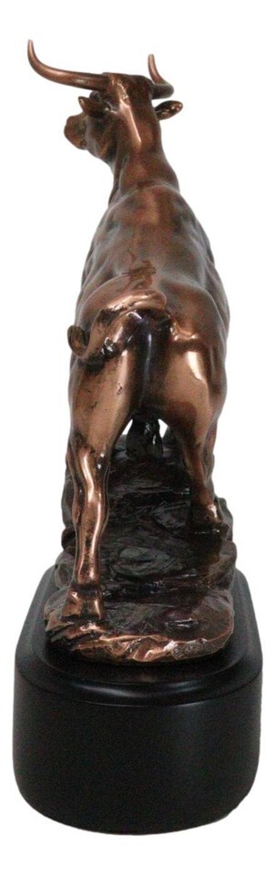 ? Bulls epitomize masculinity in the animal kingdom, symbolizing strength and power in both their physical and spiritual presence. This sculpture features a muscular bull stepping up on a rocky steppe. This 360 degrees, highly detailed sculpture, portrays accurate features of the bull, set on top of a black plastic base.