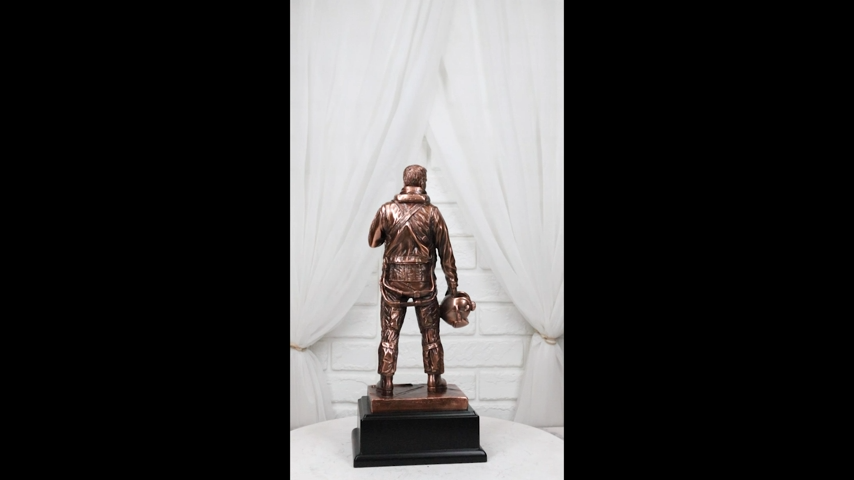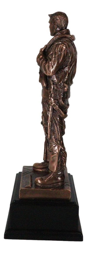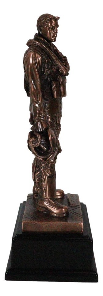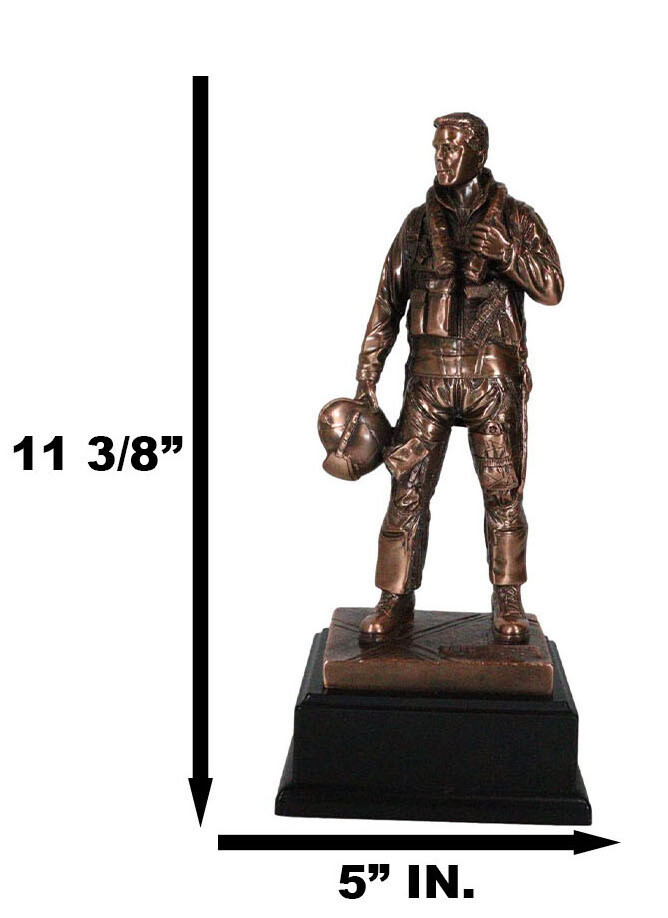 ? This AIR FORCE Jet fighter pilot in uniform figurine is made of the highest quality resin, undergoing the process of bronze electroplating giving it a uniform shine on the inside as well as the surface of the figurine. This process makes the figurine resemble the look of actual bronze but with much lesser weight. To add sculptural aesthetics and display worthiness, we add accent black plastic bases to the sculpture.