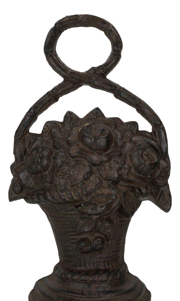 ? Enhance the beauty of your home with our exquisite Flowers in Basket cast iron door stopper! Crafted with meticulous attention to detail, this door stopper features a charming design of blooming flowers nestled in an elegant basket. It adds a touch of elegance to your decor and also serves as a functional and reliable door stopper. Its sturdy construction ensures that your doors stay securely in place, while its delightful floral motif brings a touch of nature indoors.