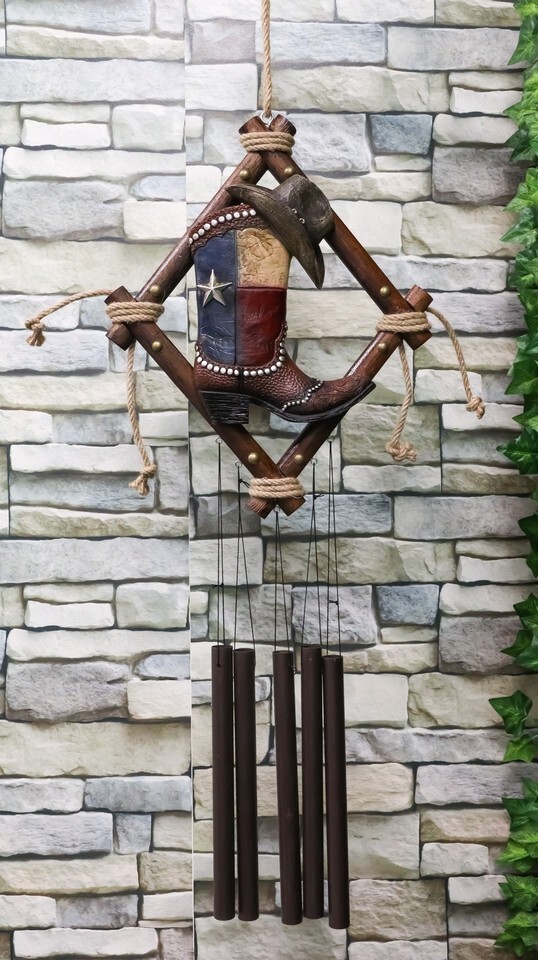 ? Celebrate the Lone Star State with our Texas Flag Cowboy Boot With Hat Wind Chime. This charming wind chime captures the spirit of Texas with its unique design featuring the iconic Lone Star colors combined with a cowboy boot and hat. The delightful chimes evoke the essence of the Texan way of life, adding a touch of Western flair to your surroundings. Whether hanging on a porch, patio, or in your garden, this wind chime will impress!