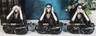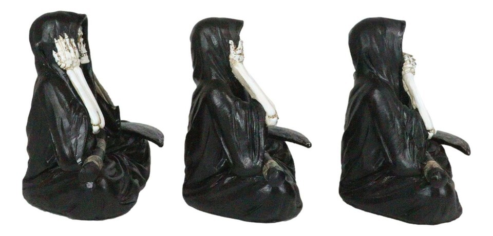 ? Needing a cool centerpiece for your party or desk? These see hear speak no evil grim reaper skeletons are the perfect choice for you! They will be a great reminder for you too that you need to watch what you see, hear and speak!!! Each of these reapers is acting out a familiar tale of see hear speak no evil with a wide grin that is both spooky but yet funny. A soul reaping scythe is on each lap. These reapers are designed to sit nice and cozy on a flat surface.