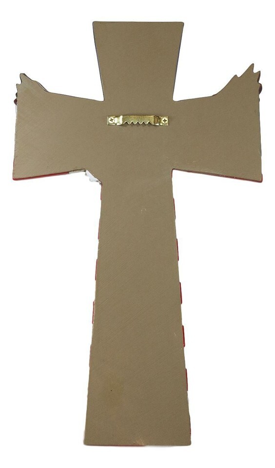 ? This Patriotic American Flag With Bald Eagle wall cross measures approximately 12.75" tall, 8" wide and 0.75" deep. The wall cross weighs about 1 pound.