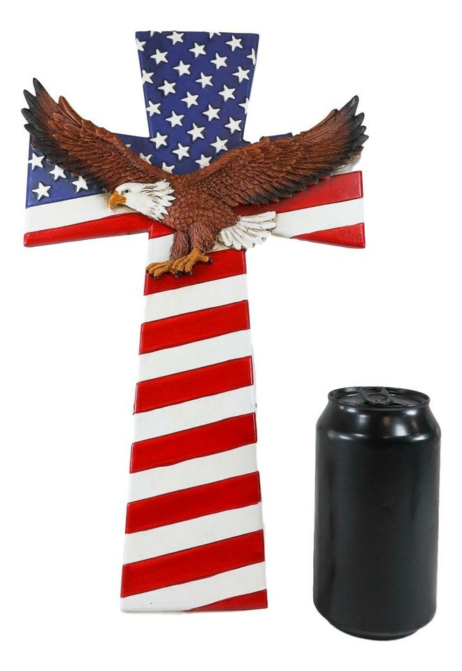 ? This Patriotic American Flag With Bald Eagle wall cross is made of polyresin, handpainted and polished individually. Because our polyresin products are individually hand-crafted works of art, colors may vary slightly from what is pictured here.