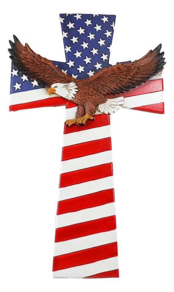 ? Show your patriotism through this beautiful wall cross. All elements of the United States Of America are coming together in one, starting from the iconic star spangled banner flag mapping out the whole cross to the majestic proud bald eagle soaring in the center with its spread out wings.