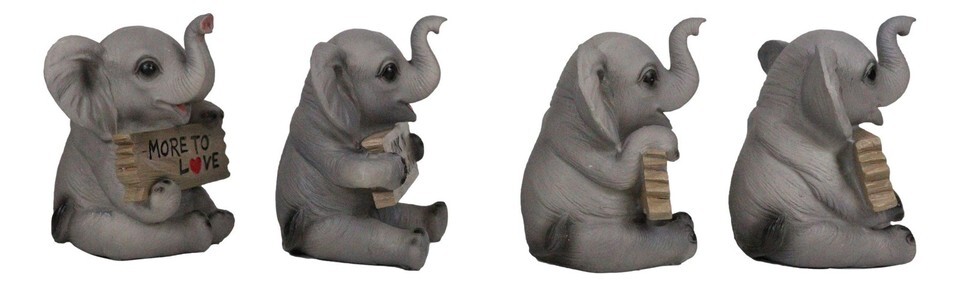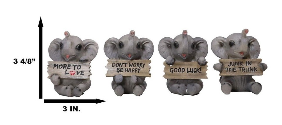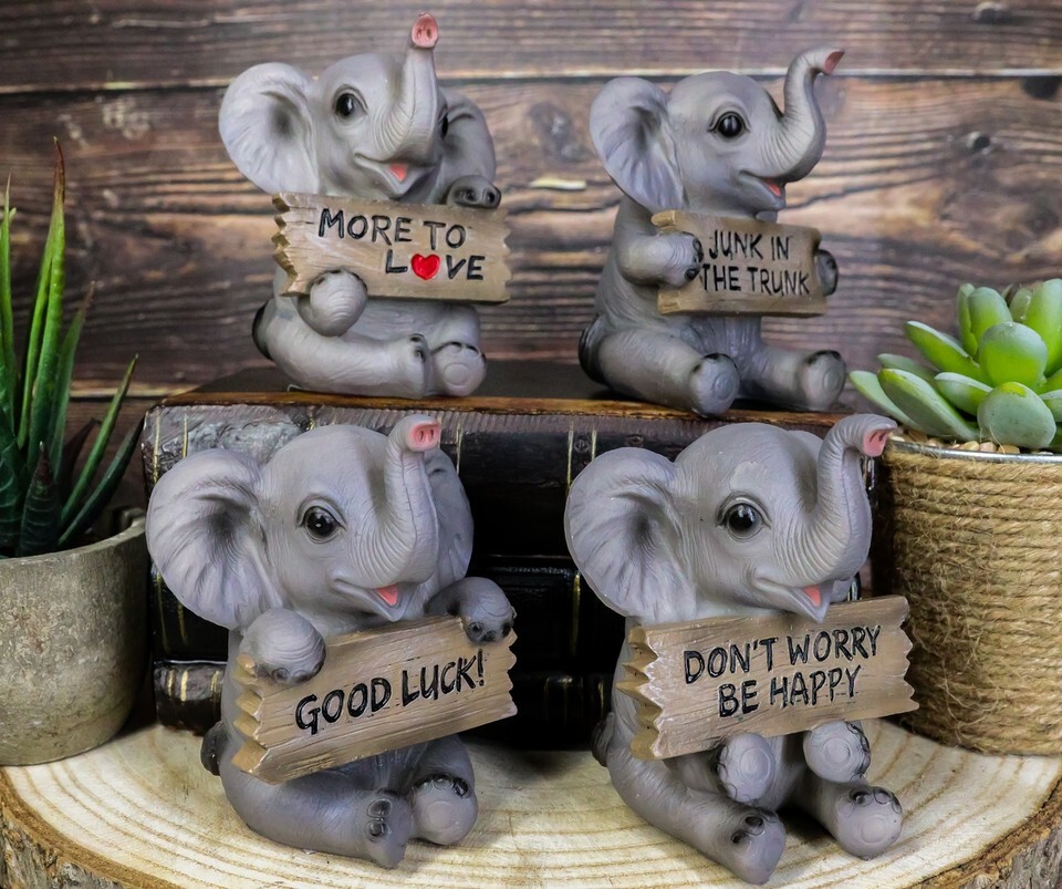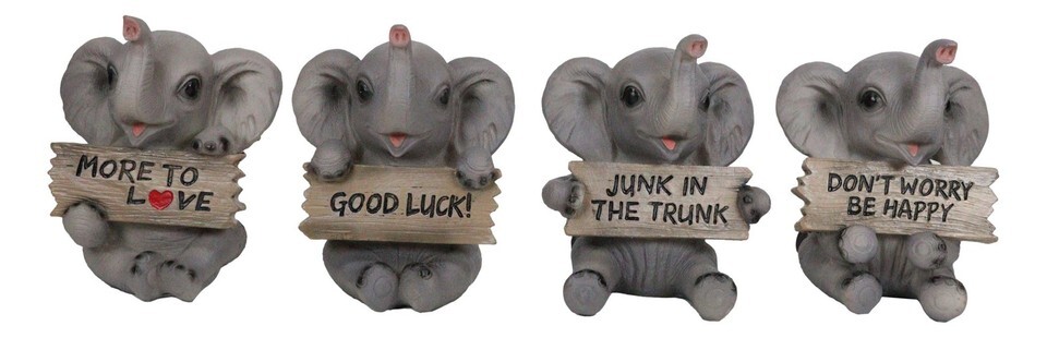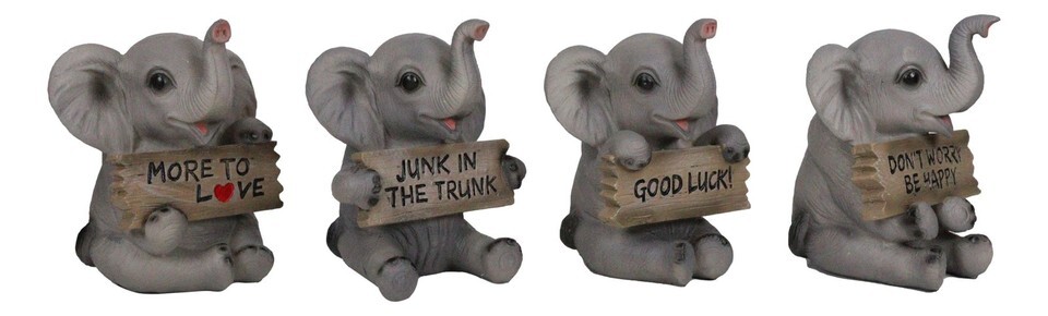 ? These adorable elephant figurines portray baby pachys holding a wooden plank sign each with humorous slogans. One says More To Love, another says Junk In The Trunk, the third one says Don't Worry Be Happy and finally Good Luck!