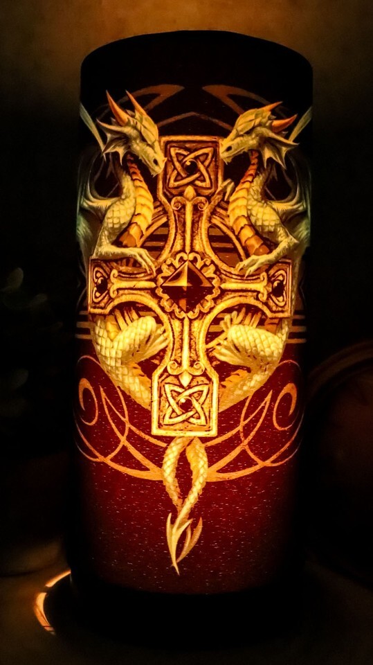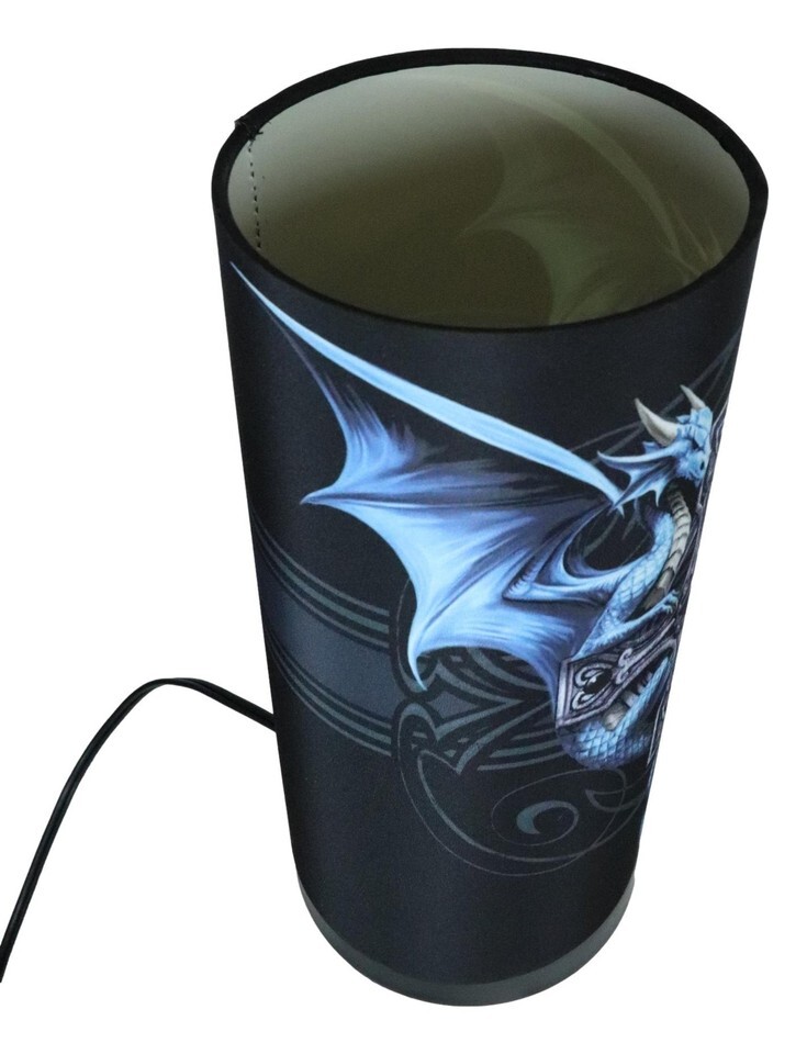 ? A column of polyester is printed in full color with this lovely art print by Anne Stokes. The shade is mounted in a black cast resin base with attached US standard 110v light cord with on/off switch. The entire column lamp lights with a soft glow when on for a magical night light or ambient light anywhere in your home.