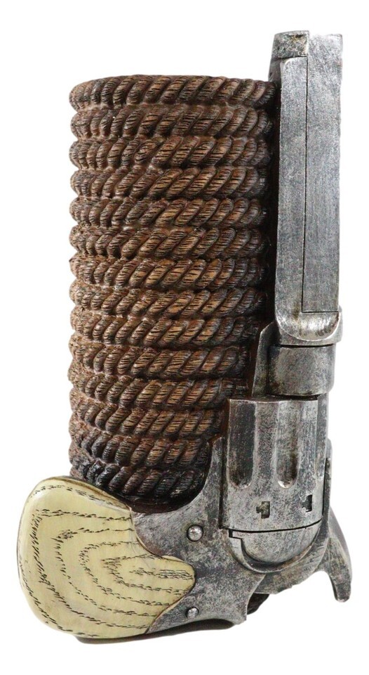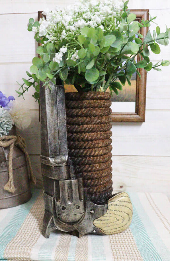 ? A perfect addition to your home, office, or mancave, the western revolver and ropes floral vase is the perfect non-lethal decorative accessory for firearm enthusiasts collectors. Shaped like a revolver gun pitted against a stack of braided ropes, this unique floral vase will hold your most beautiful floral arrangements with a wild wild west vibe!