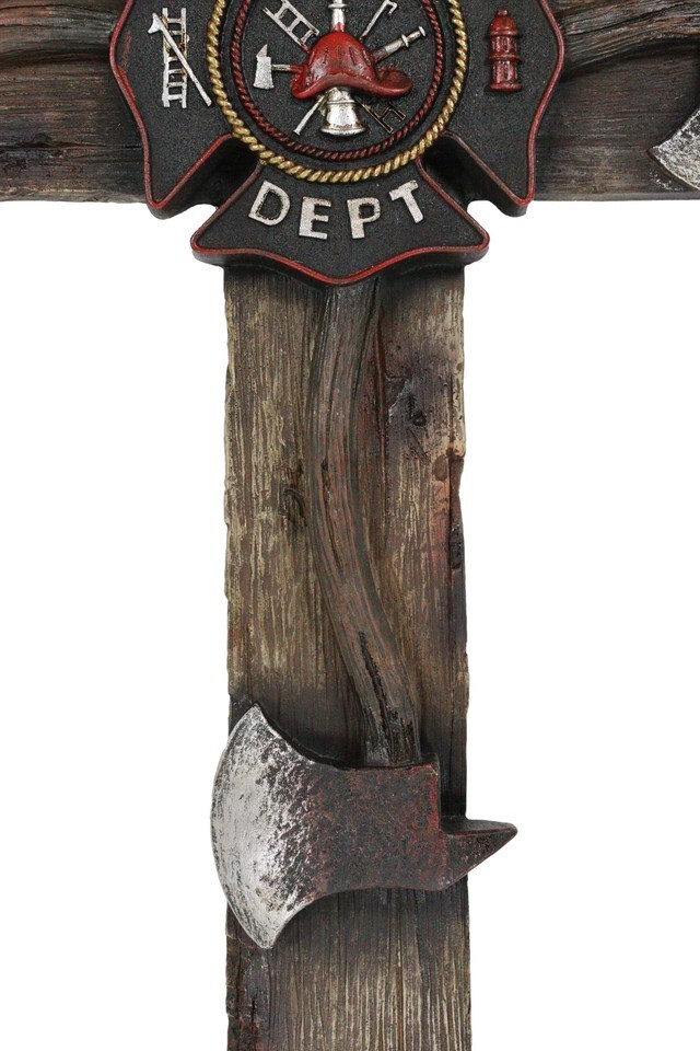 ? This hanging wall cross is the perfect addition to any home of faith. Its unique style is sure to become a welcome staple of any room. Consider this item as a gift for any of your faithful friends or family. Starting with a faux wooden finish, a Fire Department Maltese Cross Emblem is set in the center. 2 fireman axes stretch out on each beam plank of the cross.