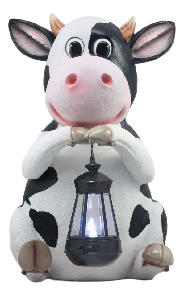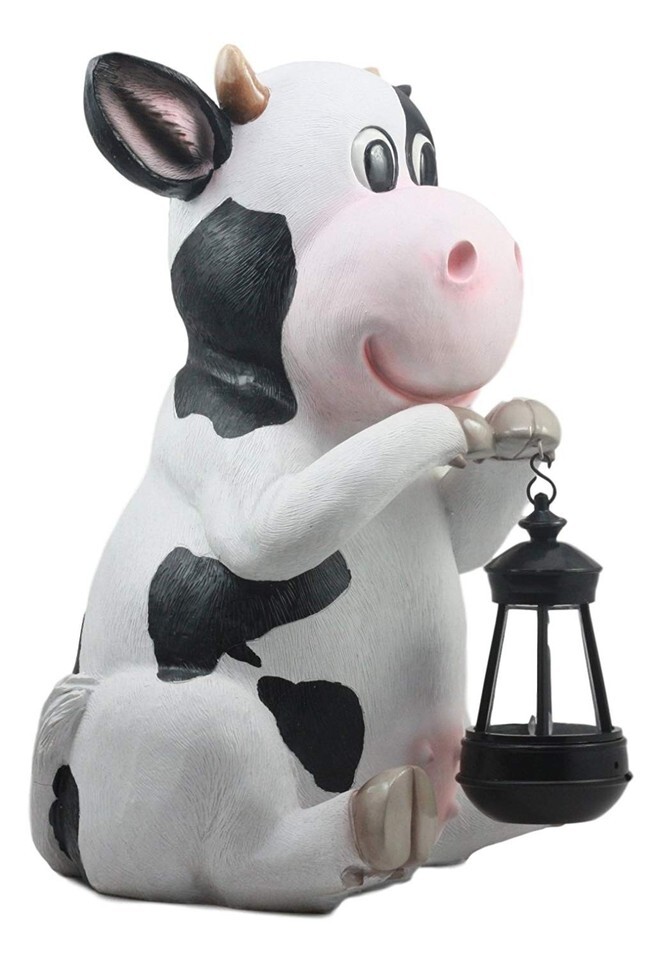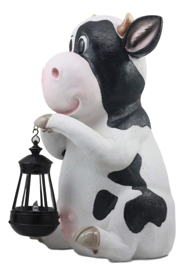 ? This Holstein Cow Statue With LED Lantern Light is made of designer composite resin, hand painted and polished individually.