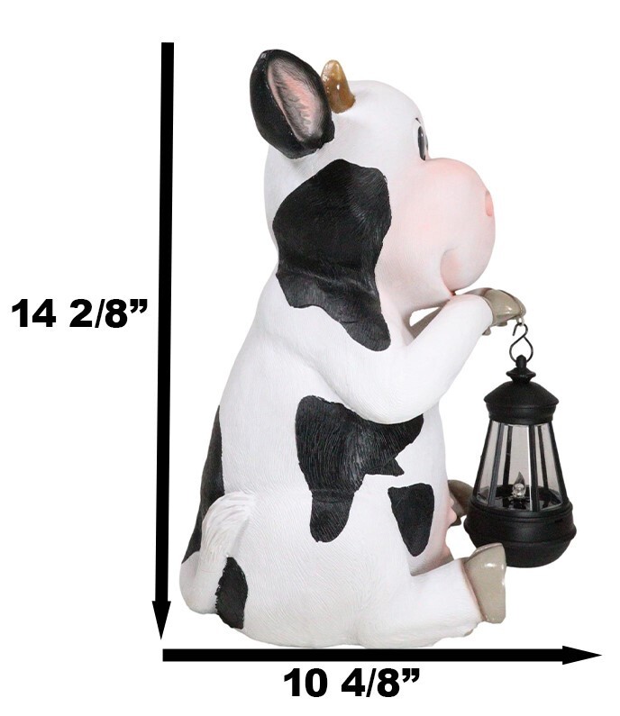 ? This Holstein Cow Statue With LED Lantern Light measures 14.5" tall, 10" wide and 8.5" deep approximately each.