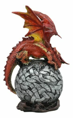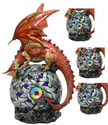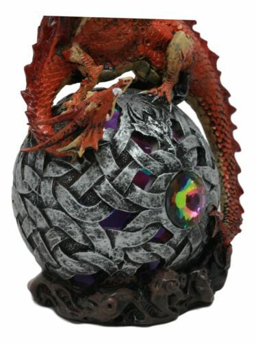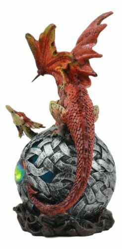 ? This Gorgeous Red Fire Dragon crouches on a light bearing gyrosphere, container energy and life for the universe. He guards the orb and all the power within it from all that seeks to abuse it for selfish ambitions. The Orb holds a color changing LED light that glows in the night, creating a beautiful mythical fantasy atmosphere in your home!