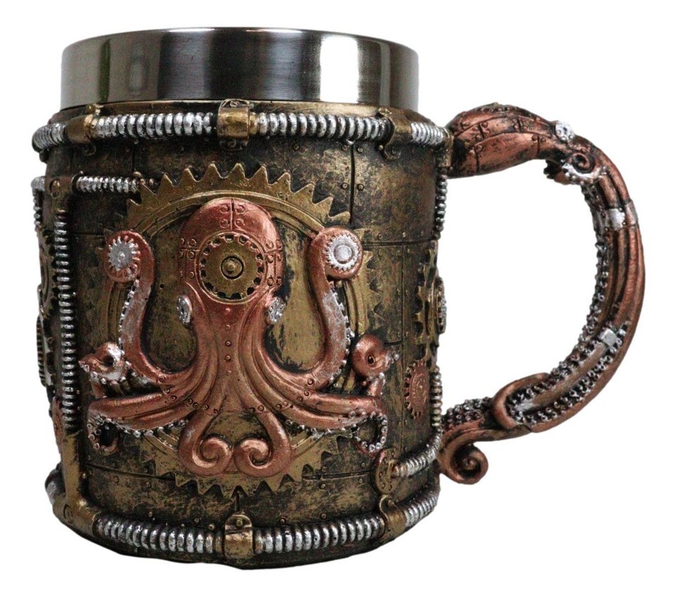 ? This Unique Steampunk Octopus Drinkware is made of fine polyresin topped with a stainless steel cup liner, hand painted and polished individually. The stainless steel liner is safe for drinking and washing. The colorful resin body should only be cleaned with warm cloth (without soap).