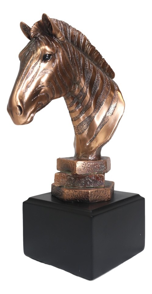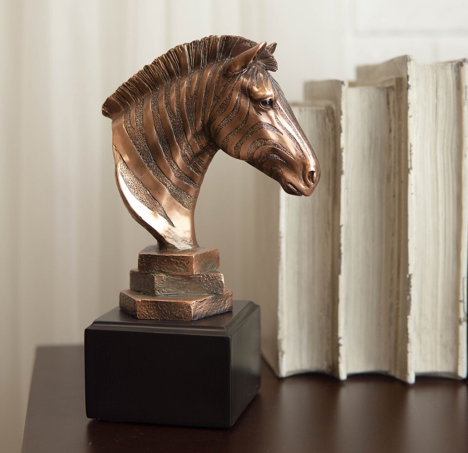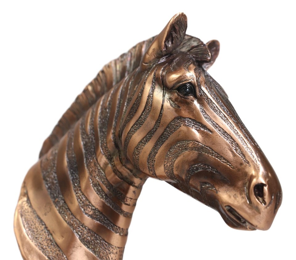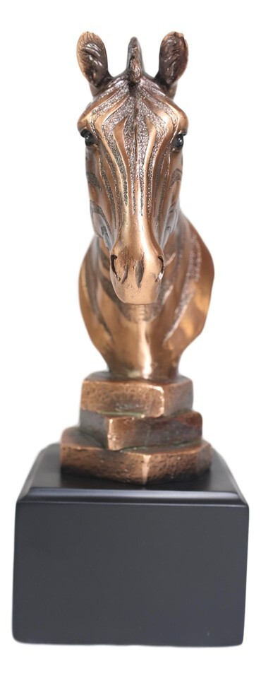 ? This Amazing Zebra Bust Figurine is made of the highest quality resin, undergoing the process of bronze electroplating giving it a uniform shine on the inside as well as the surface of the figurine. To add sculptural aesthetics and display worthiness, we add accent black plastic bases to the sculpture.