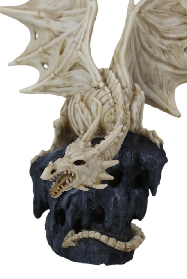 ? If you are a fan of macabre fantasy decor pieces, you are sure to appreciate the look of the Dragon Skeleton Light-Up Statue. The skeleton dragon lays over the top of a dark grey, stone platform. The platform has openings in the sides. The dragon has its webbed wings lifted in the air. The rib cage of the dragon and the openings in the platform light up with LEDs. You can add this light-up statue to any skeletal decor or dragon collection.