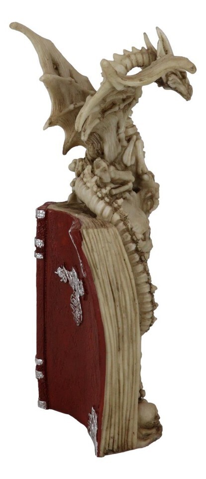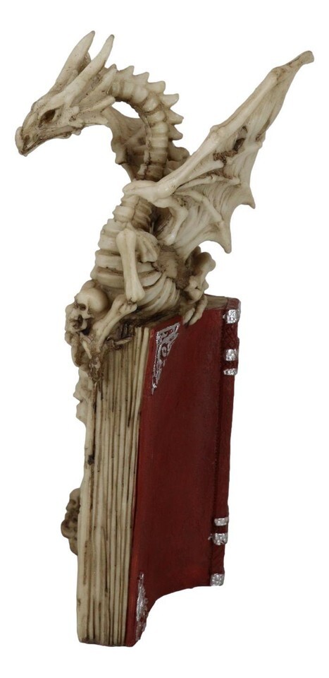 ? This Skeleton Bone Dragon On Book Of The Dead Figurine is made of designer composite resin, hand painted and polished individually. Color Tone may vary slightly from pictures.