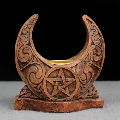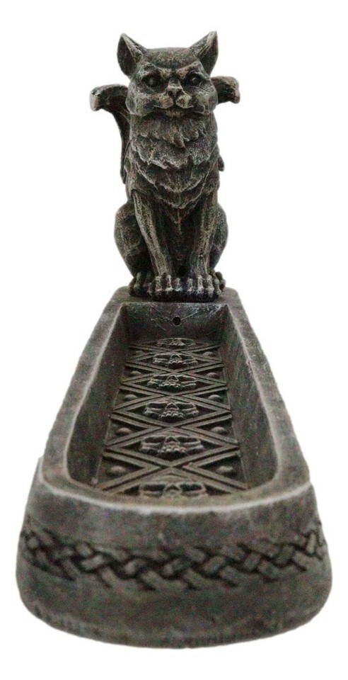 ? A stoic angel cat sits the end, surveying his surroundings, sitting in repose on his throne. An incense stick can be placed into a hole that sits by its paws, where it will happily and safely release its beautiful aroma. The catch basin is designed in geometrical diamonds with skulls at the center, while Celtic Knotwork designs are tooled onto the sides of the base catch. A taper candle fits behind its back and it will create a warm glow in your room.