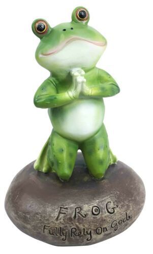 ? This inspirational figurine shares a few truths with us in leading a fulfilled life. First lesson is that Frog leaps of faith starts with a humble prayer. Second lesson is using the acronym of FROG which translates Fully Rely On God.