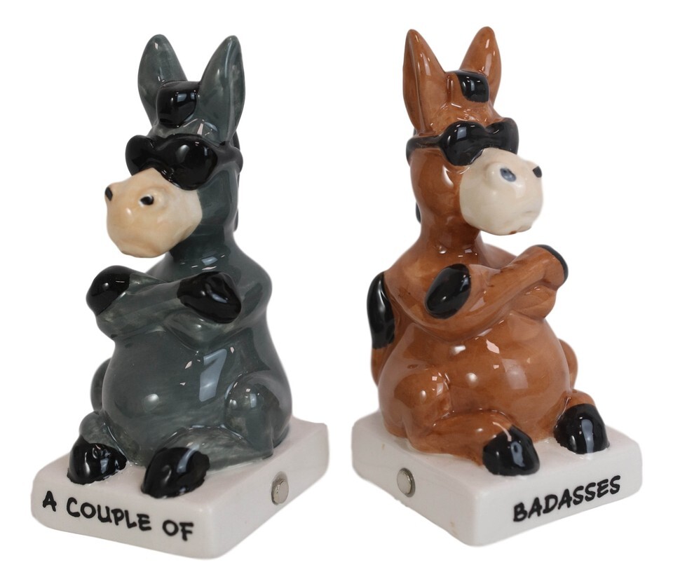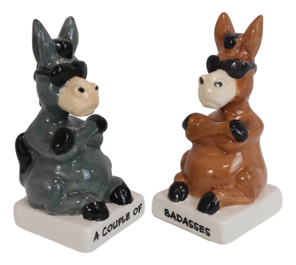 ? These chilling donkeys are just not having it! If you share the same attitude, then this salt and pepper shakers set is for you! Black shades, crossed arms and beer belly. These Badass Donkeys are magnetically attracted to each other, forming a double trouble!