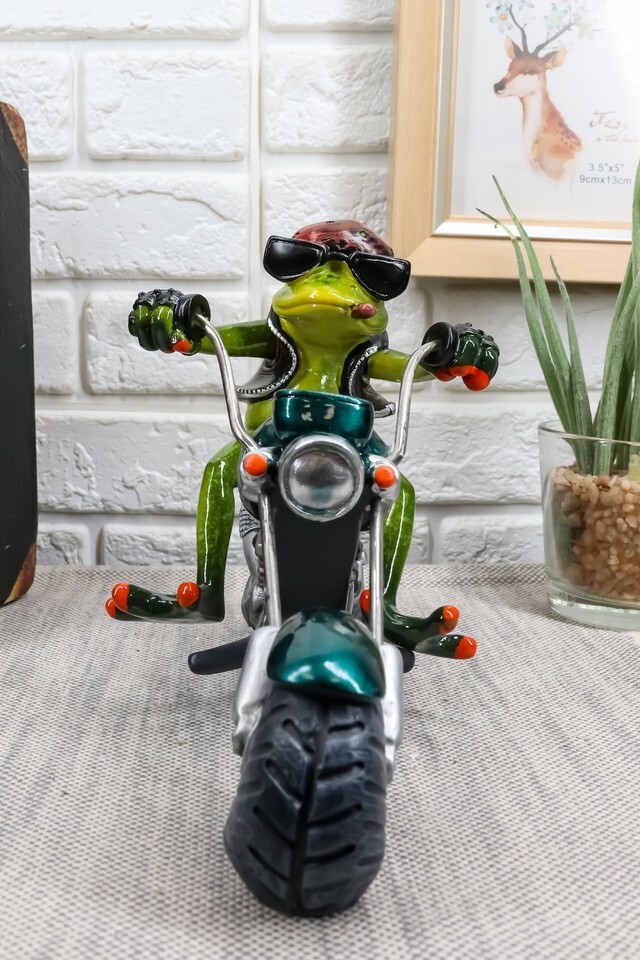 ? This Biker Frog Statue is a gorgeous and stunning piece of art. Our sculptors and painters have done an excellent job in creating great details to the sculpture. Display this centerpiece in your home and watch it gain admiration from all eyes that see him.