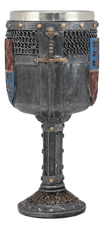 ? Drink to your health with 1000 years of proud European Kingdoms history with this sturdy coat of arms goblet. Cast in the finest resin, this high-quality goblet is painstakingly hand painted to look armoured, with rivets holding chainmail in place, excalibur swords and medieval shields with the Fleur De Lis symbols as well as the Three Lions royalty. This wine goblet is nothing short of an exquisitely detailed medieval themed masterpiece.