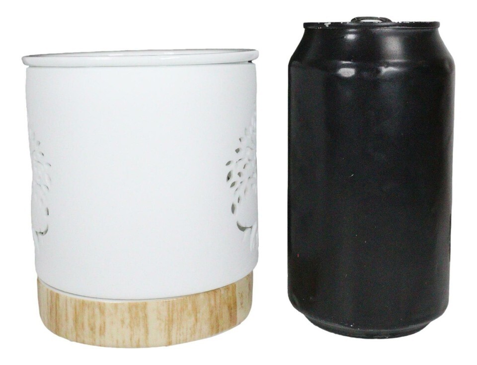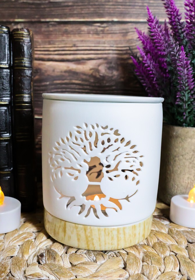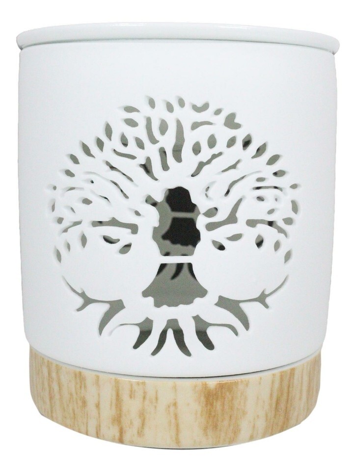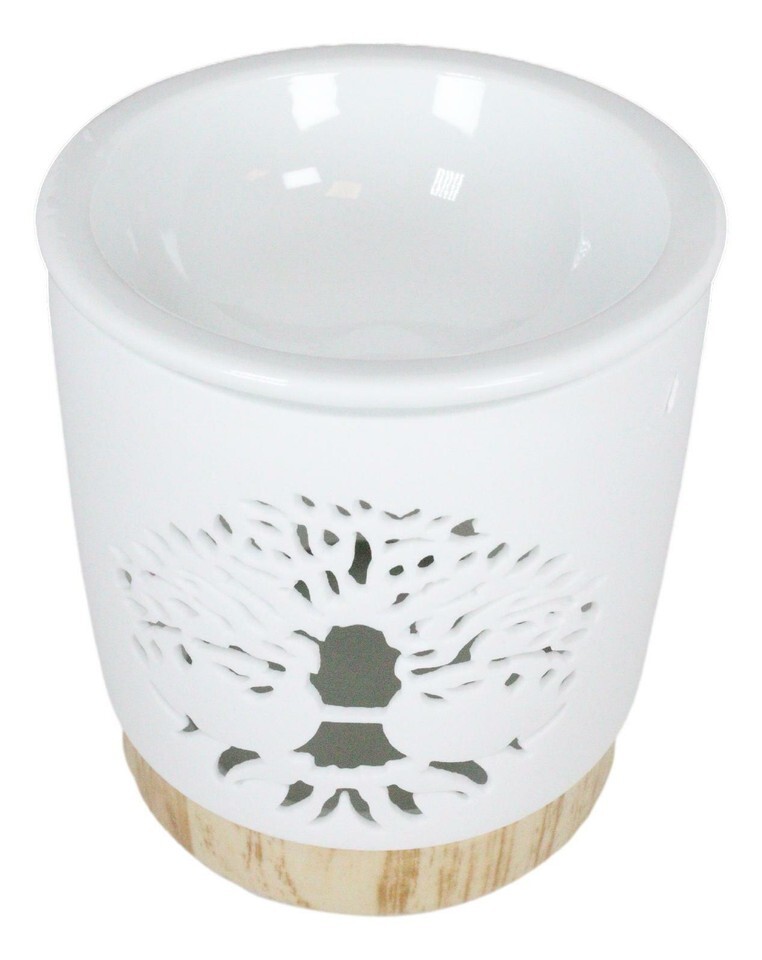 ? This is a white ceramic oil burner that features a filigree cut-out of the Tree of Life design. The Oil warmer has a unique wood-effect ceramic base to provide insulation for the furniture surface.