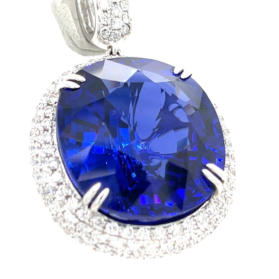 Gorgeous 35.39 ct Faceted Tanzanite Solitaire in 18k White Gold Pendant Setting w/ 2.44 ct Diamond Accents
