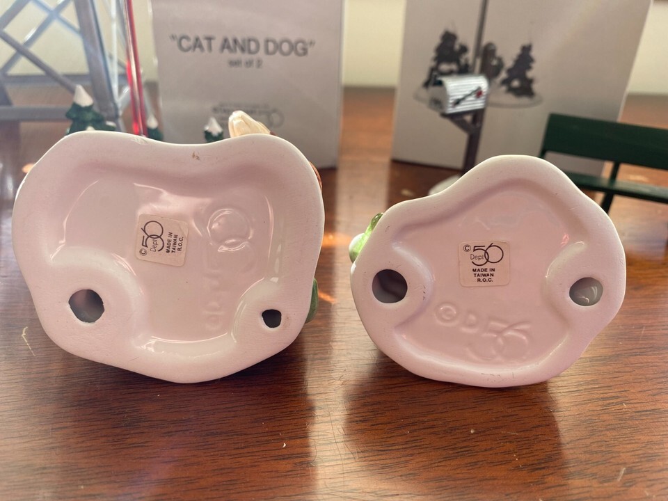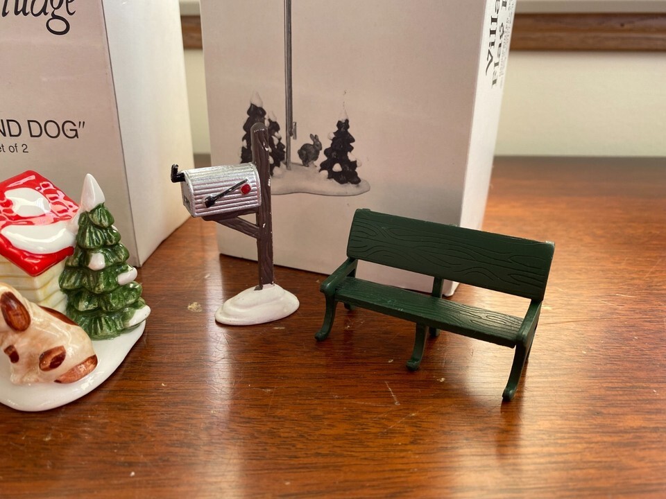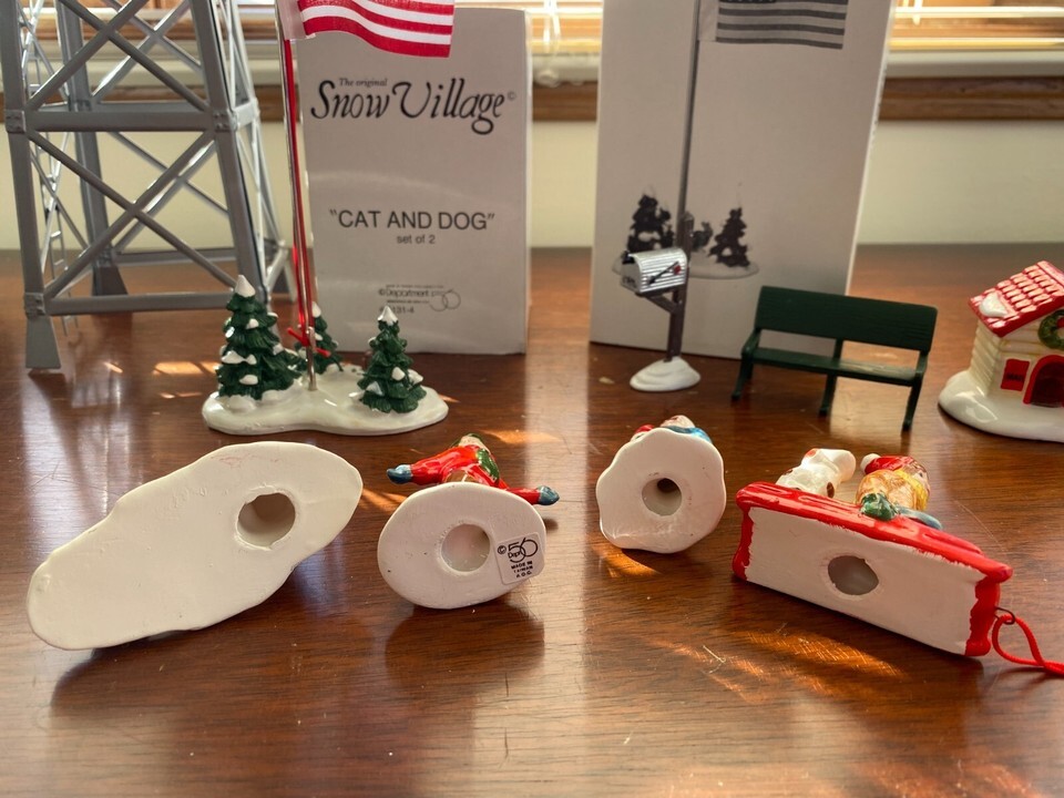 All pieces are in excellent condition. No cracks or chips. Original boxes are included with the Cat and Dog, the Christmas Children, and the Village Flag Pole. All 3 boxes are in good to very good condition. The Water Tower, the Benches, and the Mailboxes do not come with their original boxes. Smoke free, Pet free, Odor free. See photos for a more complete description of the items and their condition.