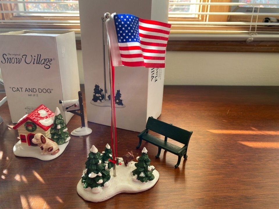 Dept. 56 Snow Village Tower, Flag, Cat & Dog, Christmas Children, Bench/Mailbox