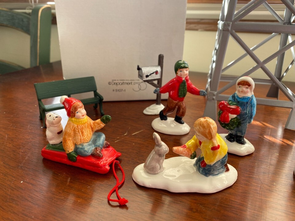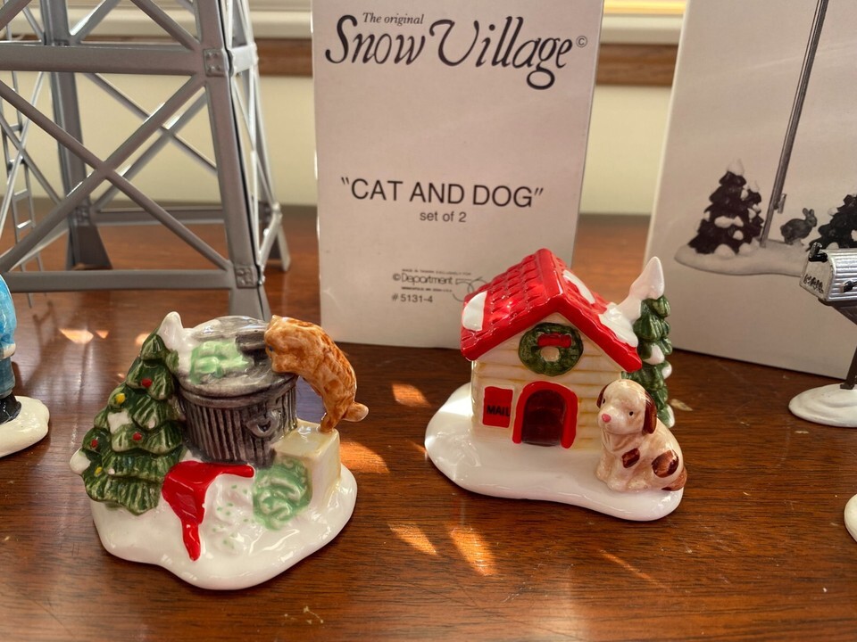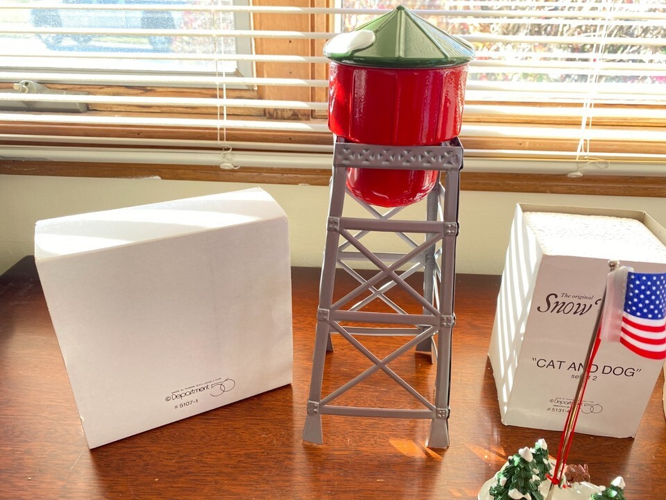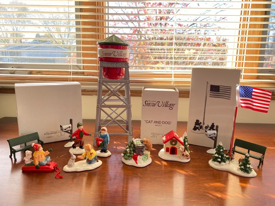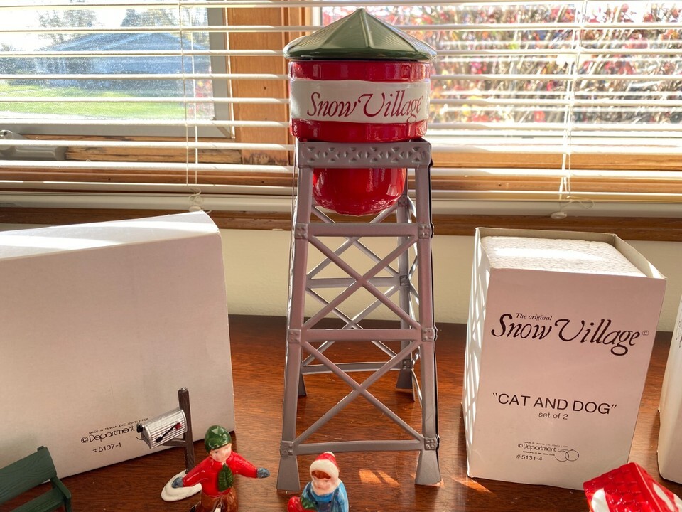 Vintage Dept. 56 Snow Village "Snow Village Water Tower" #5133-0, "Cat and Dog" Set of 2 #5131-4, "Christmas Children" Set of 4 #5107-1, "Village Flag Pole" #5177-2, "Green Metal Bench" Set of 2, and "Mailbox" Set of 2. All Retired. Wonderful and timeless additions to your Dept. 56 Snow Village collection.