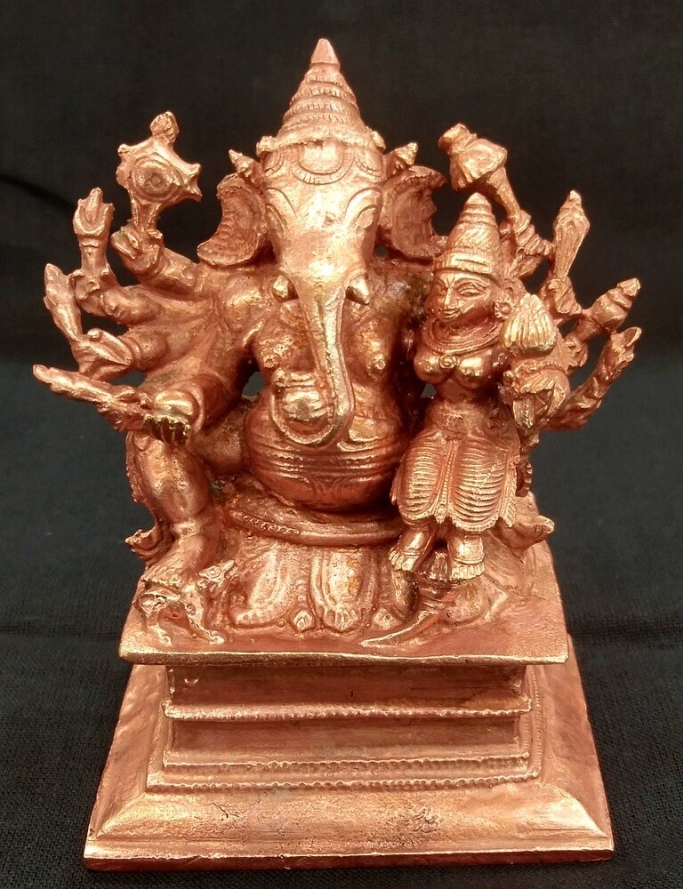 Design : Divine idol of Maha Ganapati seated majestically with one of his shaktis on his knee., a rat looking up to him is gorgeously crafted in heavy Copper by artisans of south India . Maha Ganapti having 10 hands holding holding tusk, a pomegranate, a sugarcane bow, chakra, noose, a blue lily, a sprig of paddy, a lotus, a mace and ratnakumbha.