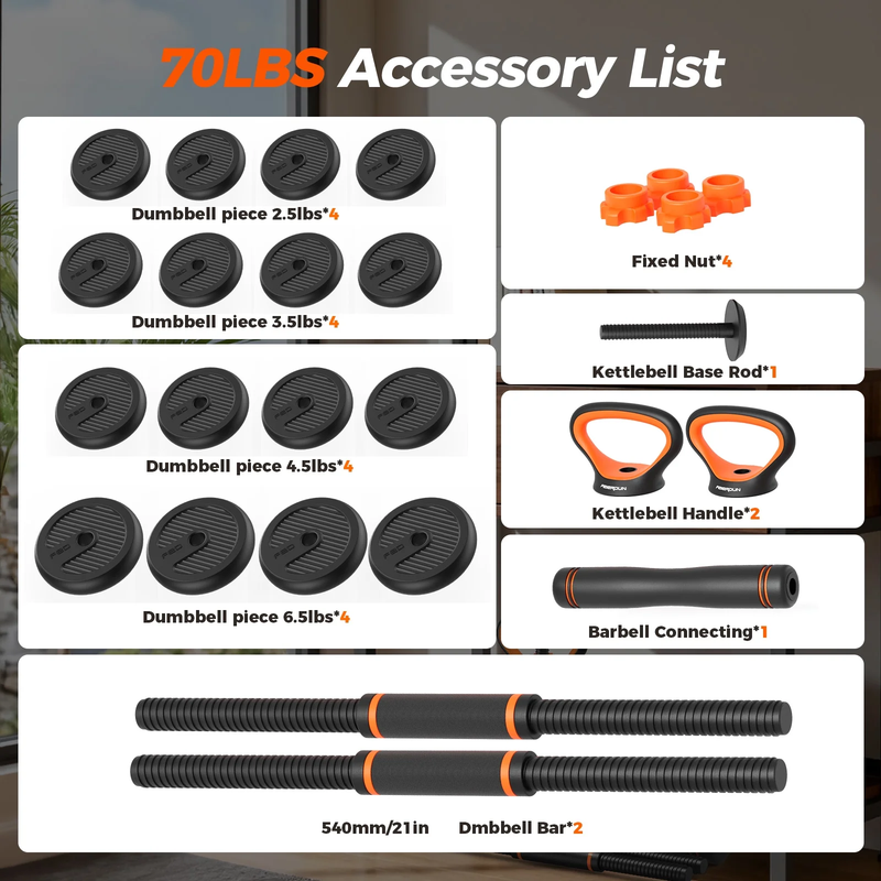 ?5 in 1 Multifunctional Dumbbell Set?With it, you can get a pair of dumbbells also barbells, kettlebells,weight plates and push-up stands, which help you do many exercises including bench presses, squats, etc. ?Durable Materials?Environmentally dumbbell pieces exterior is made of high-quality PE materials, and the inside is mixed with iron, mud, and sand, which effectively prevents floor abrasion. ?20MM Thickened Foam?The connecting rod is made of a 5mm thick steel tube + 20mm thick high-quality foam. Curved design fits the neck, which is non-slip and sweat-absorbing, soft and breathable, bringing a more comfortable exercise experience to you. ?Non-slip Dumbbell Bar?The surface of the dumbbell bar is made of ABS environmentally material and attached to a non-slip texture, which strengthens the friction of the hand and helps you control the dumbbell better during exercise. ?Safety Nuts?The sets contain four safety nuts. Nut thread thickening effectively keeps the dumbbell piece solid, to prevent movement shaking. Ensure your safety in use. ?More Weight Options?The dumbbell pieces feature a detachable design, and the adjustable weight range for the single dumbbell is 6lbs-35lbs, which meets your exercise intensity needs in different stages. Installation is easy. ?Brand Support?UPGO always due to providing our customers with the best service. If our product could not meet your expectations, please feel free to contact us, we will respond within 24 hours.