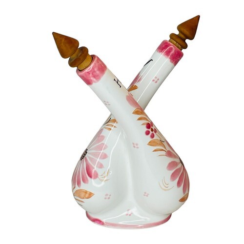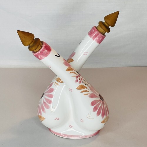 Beautiful and collectible Quimper pottery attached oil and vinegar pottery cruet bottle in a lovely white and pink floral design. Has two decorative wooden corks in each bottle. Marked ?o? for oil and ?h? for ??? vinegar. Signed on base. Great gift idea!