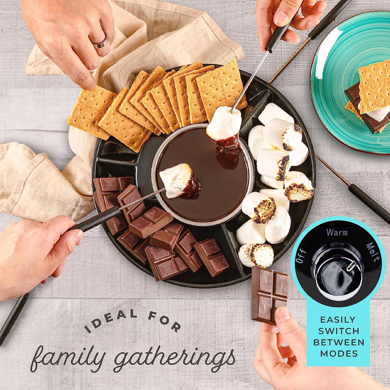 Electric Fondue Pot Set - Chocolate Fondue Kit - Temperature Control, Detachable Serving Trays, 4 Roasting Forks - Gift Set Date Night Idea. Serve at Movie Night or Game Night.