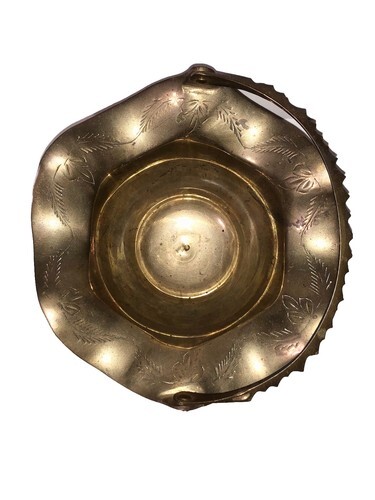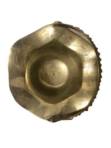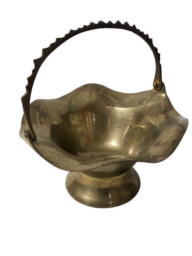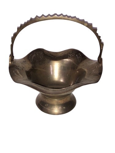 The product is a vintage brass pedestal basket with a moveable handle, originating from India. The basket features unique etched details and a ruffled edge, adding to its collectible appeal. Made from high-quality brass, this piece showcases intricate craftsmanship and a timeless design that would make a lovely addition to any metalware collection.